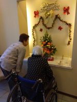 クリスマスツリー🎄のようになっていて豪華です。可愛い赤のブーツも添えられています。ご家族様が帰られる時に届き写真を撮っていました。ご入居者様もご覧になり豪華さやアイディアに感心されていました。