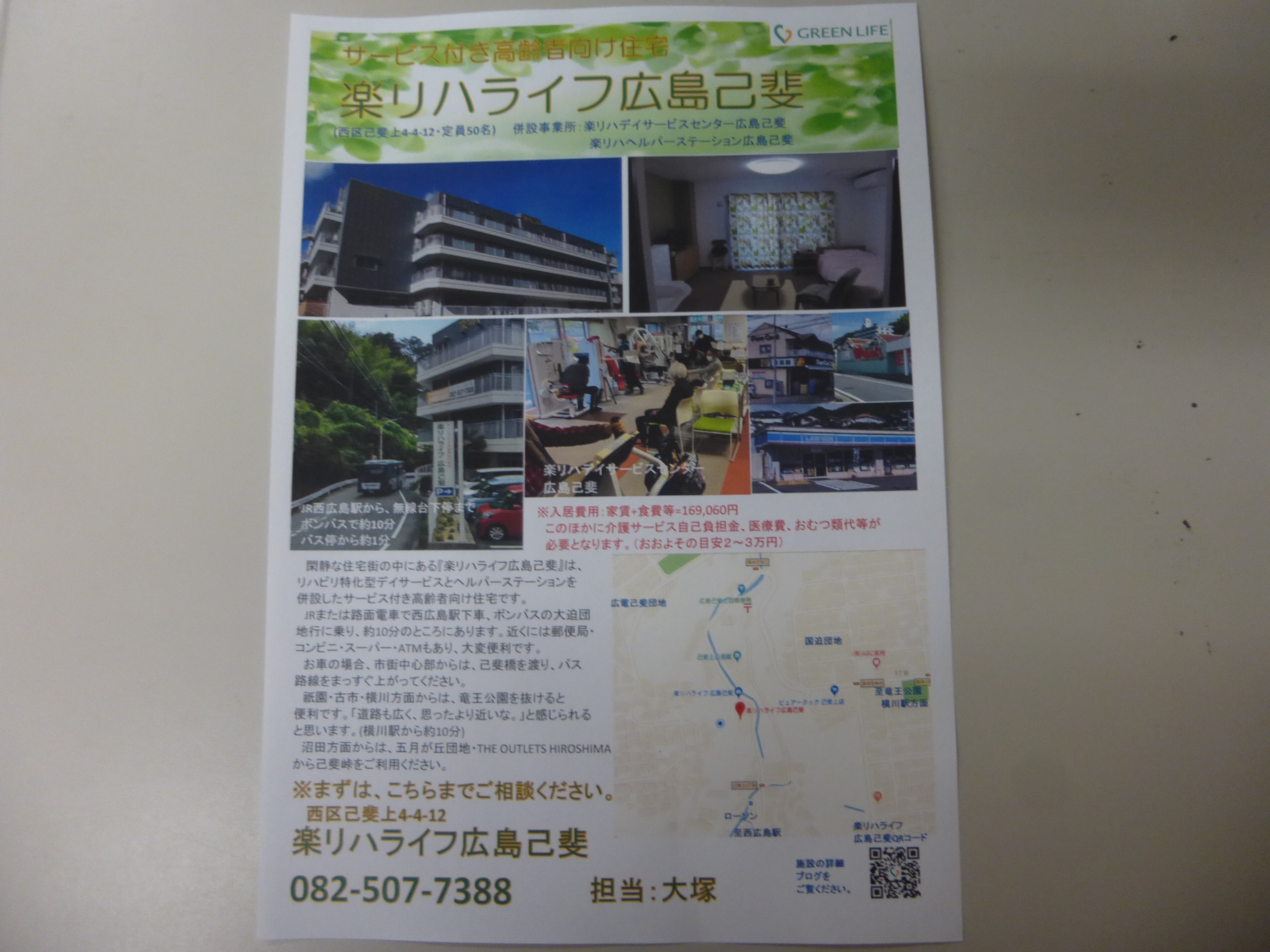 この度、令和3年4月より 施設長に就任致しました。 大塚 一徳 (おおつか かずのり)と申します。 どうぞよろしくお願い致します。 新型コロナウイルスが全世界を席巻する中、ご入居様の皆様が安心・安全にお過ごし頂けますように 全職員一丸となり、サービスに努めて参りたいと思います。 同一建物内に併設のディサービスではパワーリハビリを行っており、 施設内では「体操教室」(各週)・「書道クラブ」(毎週)をお楽しみ頂けます。 JR西広島駅からボンバスで、約10分 最寄りのバス停から徒歩で、約2分 山に囲まれた住宅街の中にあり 近隣には郵便局やコンビニがあり 毎週金曜日には 移動スーパーが施設内にやってきます。