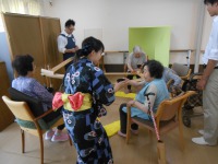 『流しそうめん♫』 Posted on 2016年8月7日 by はぴね弥富 こんにちは!! 流しそうめんをおこないました。 箸でそうめんを掴めるように しっかり手のリハビリをおこない 流しそうめんに挑みました。 皆様、しっかり箸で掴めました!! 郡上で汲んできた長良川の水が 心地いい涼を運んでくれ、 竹も天然素材なので、 感じられるひんやり感もひとしお。 山紫水明を感じる事ができました!! お土産として弥富ガーデンの 活きの良い夏野菜達を持って 帰っていただきました。 *デイサービスご利用者☆入居者募集中* 関連