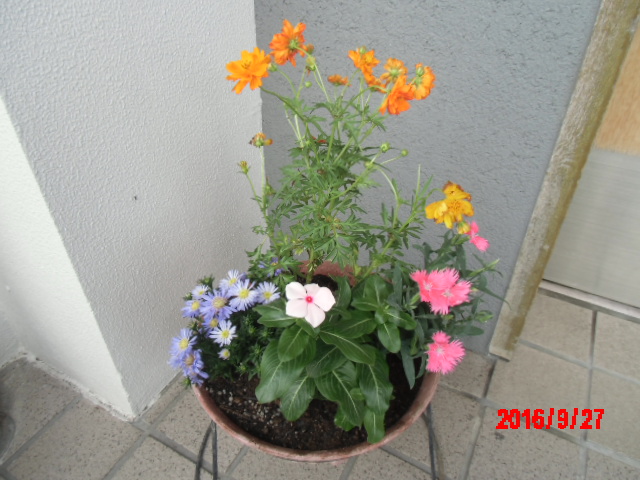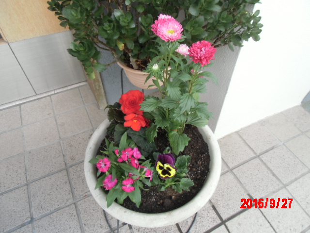 写真はその時の金木犀と、寄せ植えにして持ってきてくださった花たち。