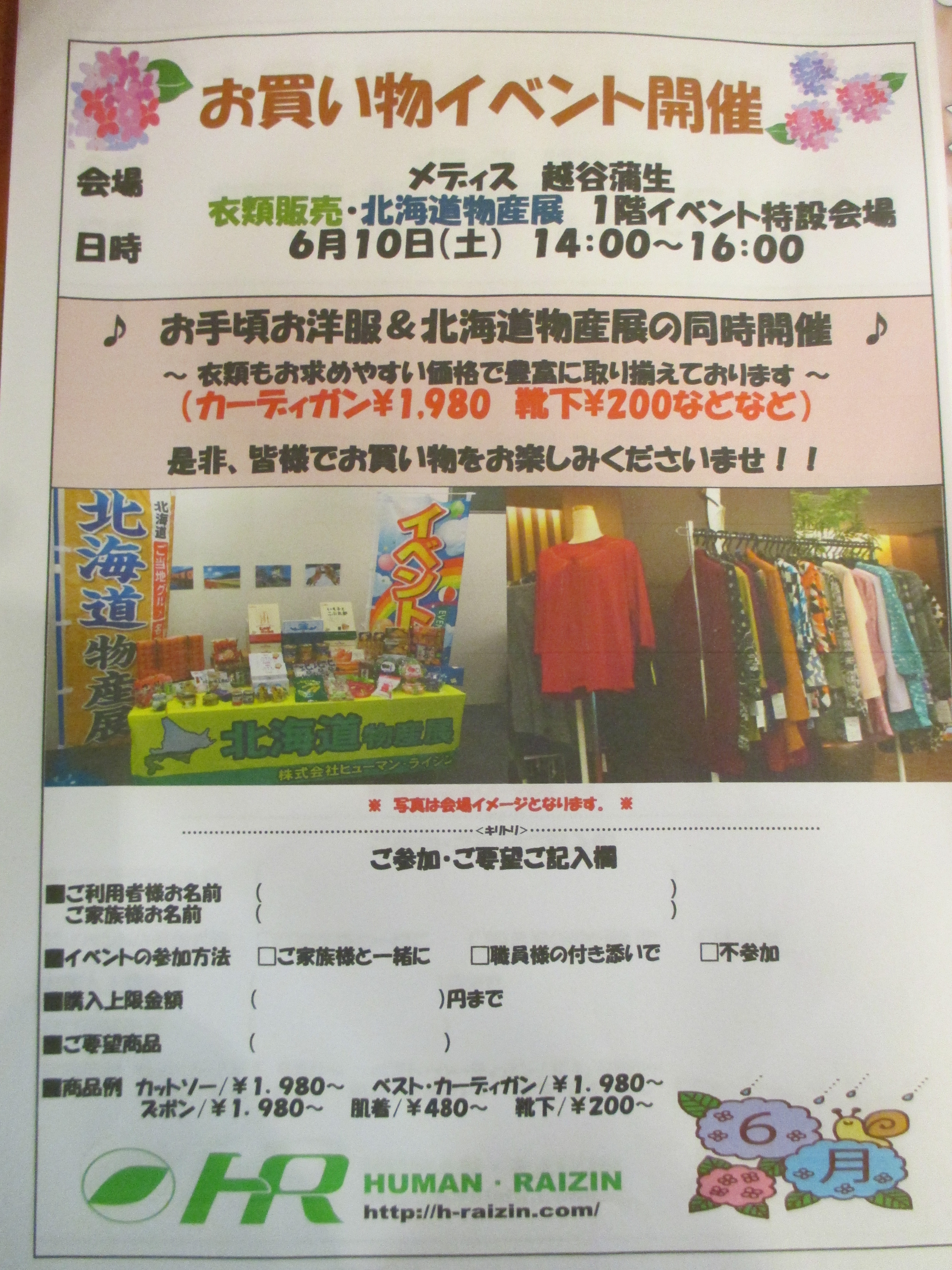 【予告】お買い物イベント Posted on 2017年5月9日 by メディス越谷蒲生 6月10日土曜日に、メディス越谷蒲生にてお買い物イベントを開催いたします。 衣類販売の他にも、北海道物産展も開催致しますので興味のある方はぜひいらしゃってください~♪ もしかしたらここでしか手に入れられない物が見つかる…かも!? 関連