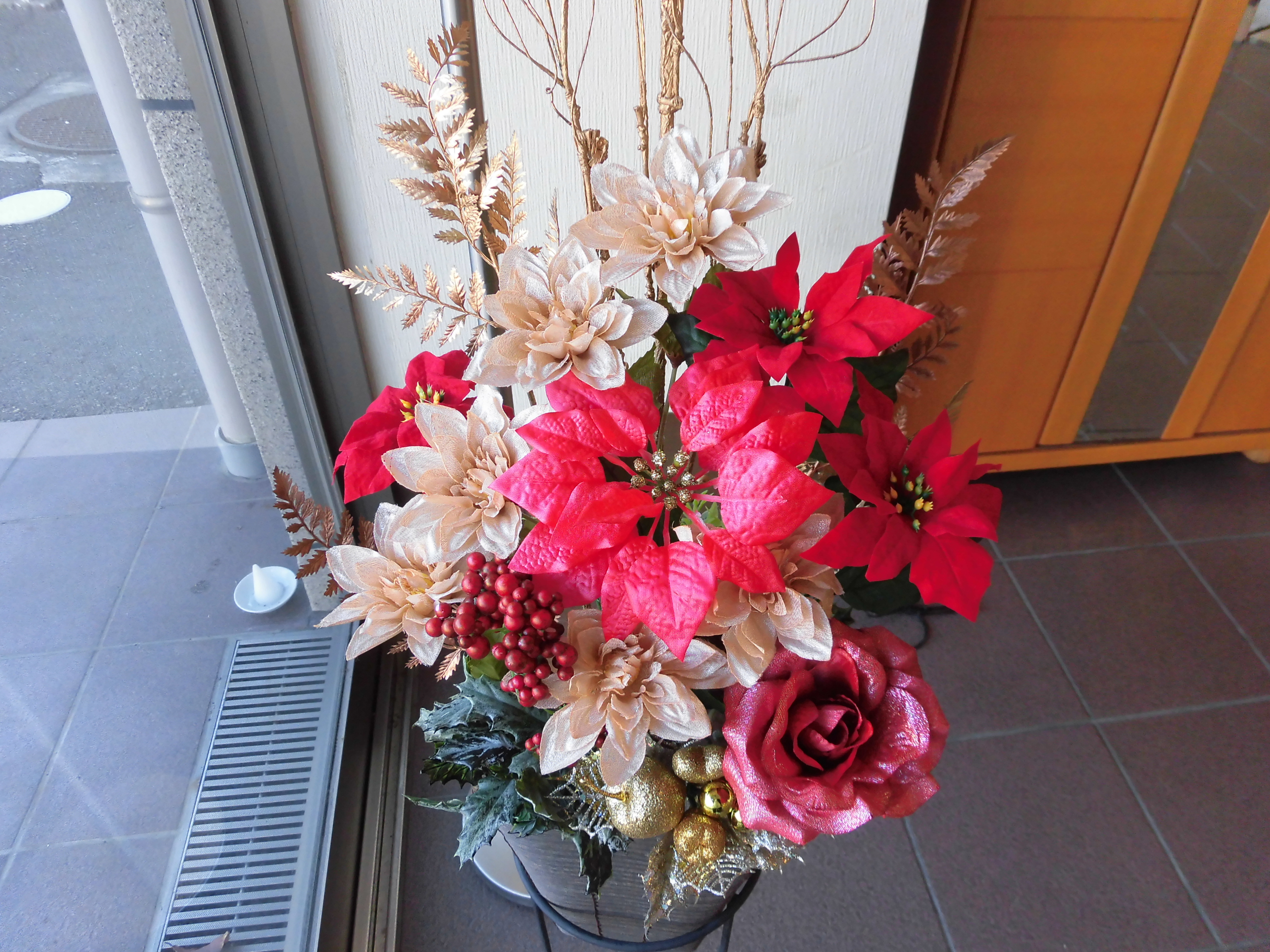 入口のお花もクリスマス使用に・・・