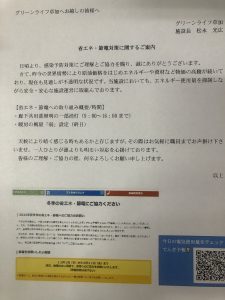 昨今の世界情勢により、原油価格をはじめエネルギーや資材などの物価高騰が続いており、現在も見通しが不透明な状況であります。当施設においても、エネルギー使用量を抑制しながら安全・安心な施設運営に取り組んでおります。
