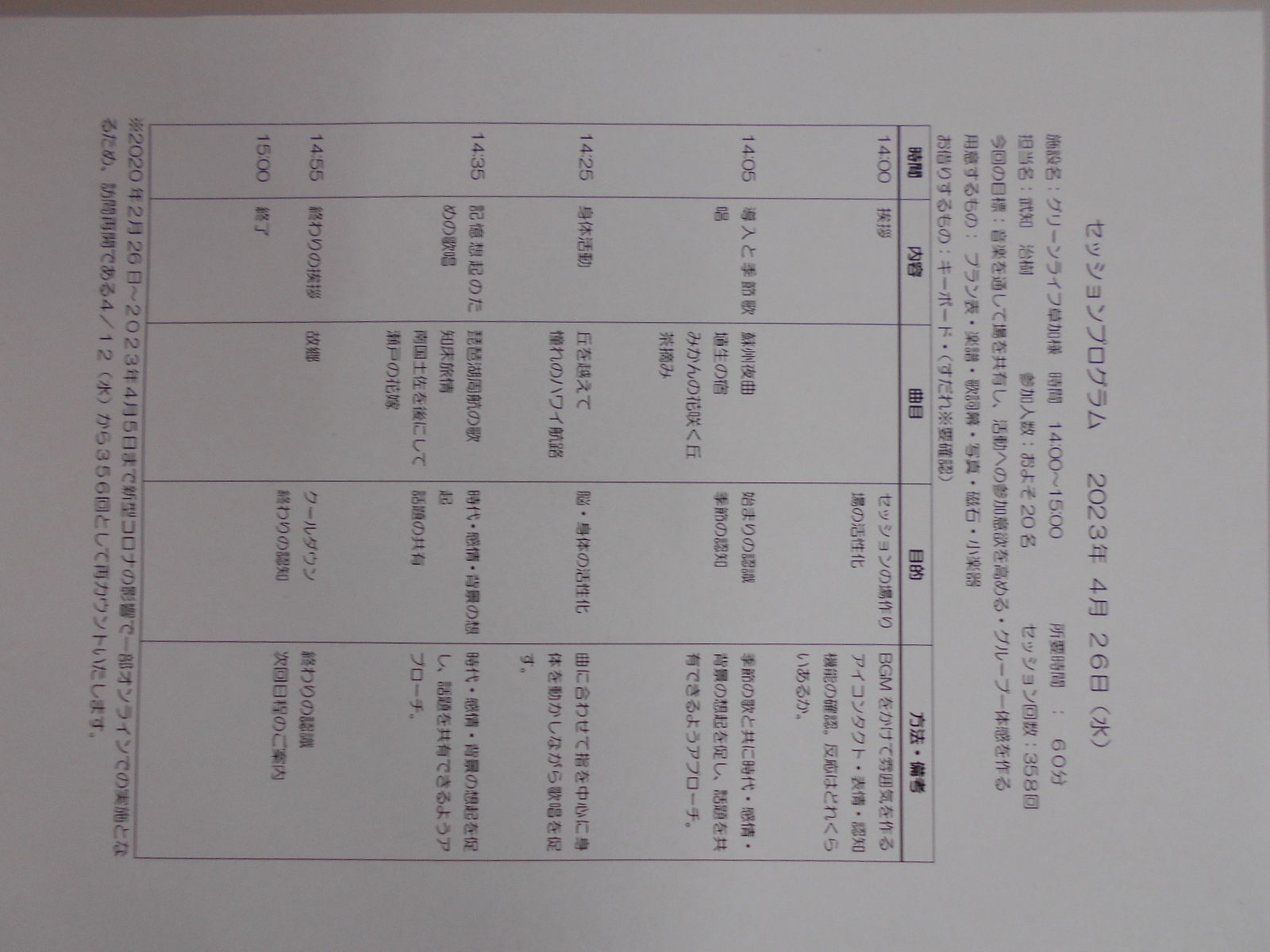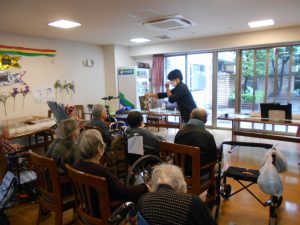 音楽療法! Posted on 2023年4月26日 by グリーンライフ草加 本日は音楽療法! 対面に戻って早4回目です! 入居者様も楽しみにされていますよ!(^^)! 本日のメニューは・・・ 蘇州夜曲、みかんの花咲く丘、丘を越えて、憧れのハワイ航路、琵琶湖周航の歌、知床旅情、南国土佐を後 にして、瀬戸の花嫁、故郷の全9曲! 1時間かけて唄と体操を行いました。 関連