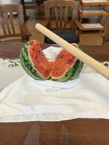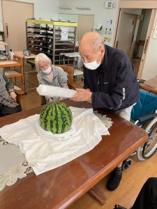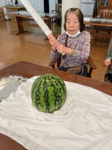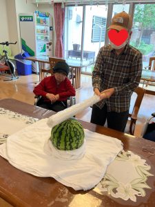 さて今日はおやつレクとして涼しい室内でスイカ割りを行いました🍉