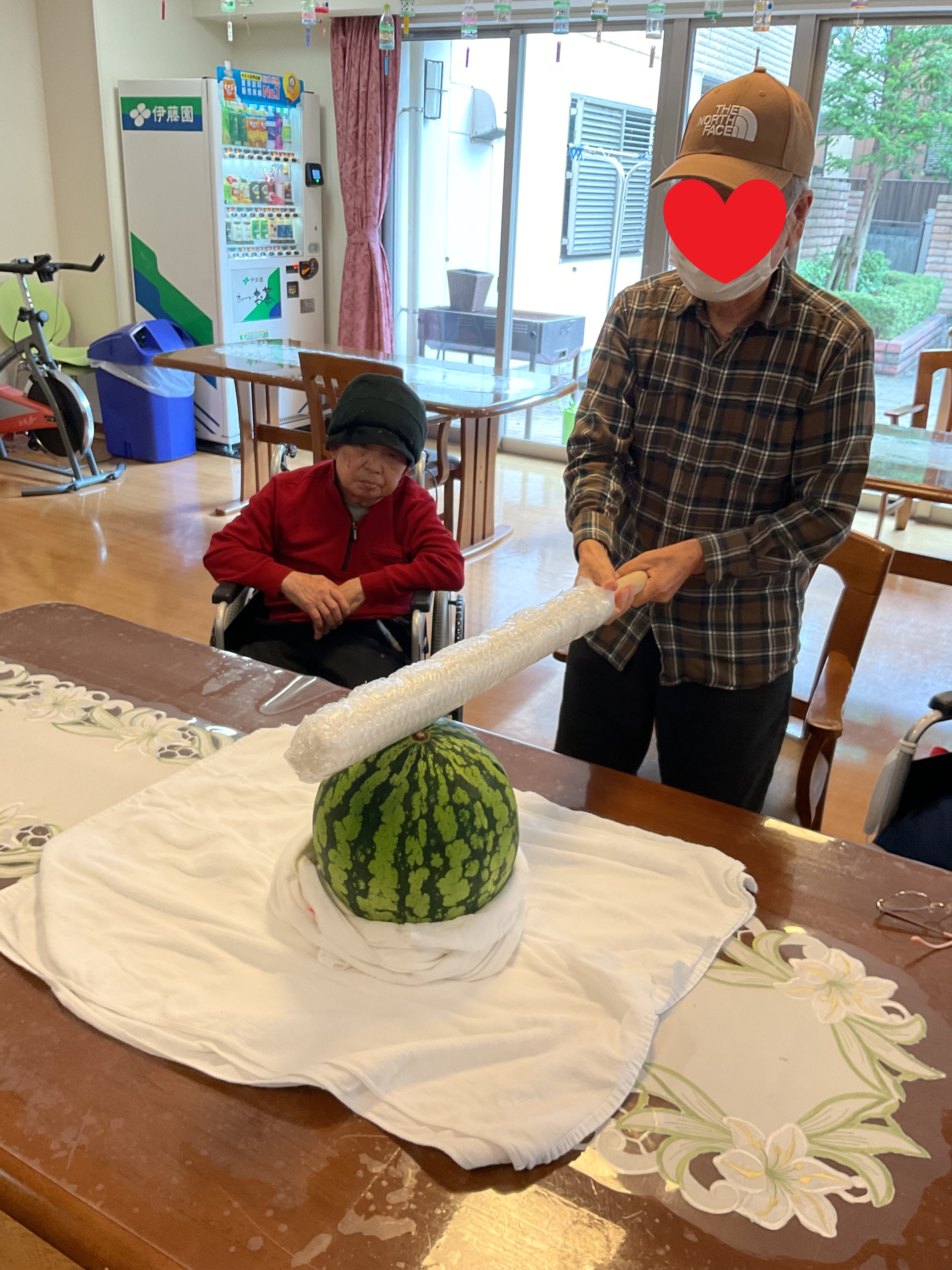 さて今日はおやつレクとして涼しい室内でスイカ割りを行いました🍉