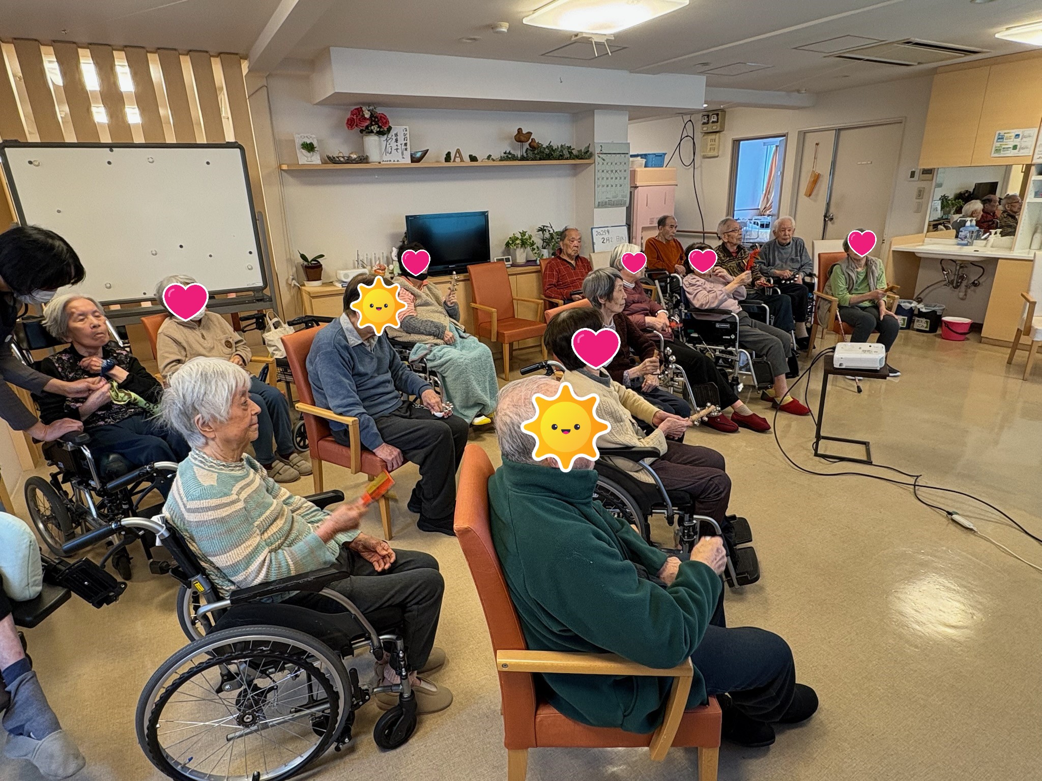 ハッピーミュージック♪ Posted on 2025年2月21日2025年2月25日 by はぴね横浜 本日は『ハッピーミュージック』がありました♪ 先生の伴奏に合わせて懐かしの昭和歌謡を歌ったり、鳴子や太鼓といった楽器を1人1つ手に取り元気いっぱいにならされていました♪ 皆様でタイミングを合わせて楽器を鳴らすとフロア中に迫力のあるな色が響き渡っていました♪ 関連