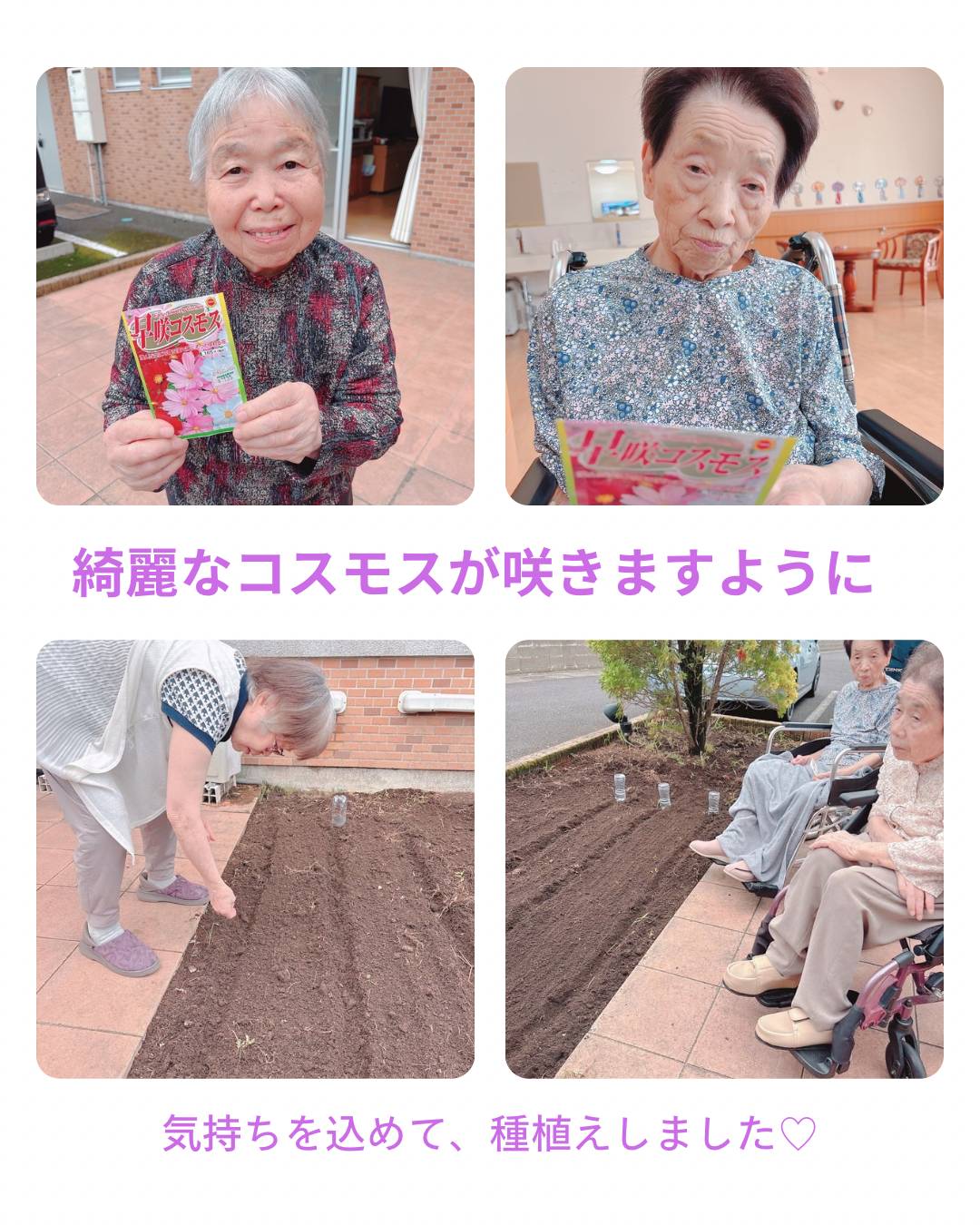 ☆綺麗な花を咲かせましょう☆ Posted on 2025年8月24日 by はぴね国分 こんにちは。 霧島市国分中央にあります 介護付き有料老人ホーム はぴね国分です。 先日、リビングのテラスから見える花壇に コスモスの種をまきました。 10月〜11月にかけて 沢山のコスモスの花が咲くように 気持ちを込めて♡♡ Ó ☆はぴね国分☆ 関連