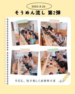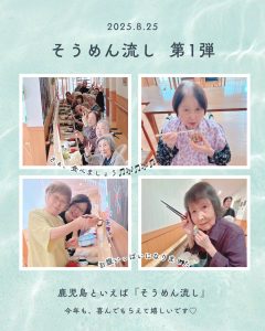 ☆そうめん流し☆ Posted on 2025年8月27日 by はぴね国分 こんにちは。 霧島市国分中央にあります 介護施設有料老人ホーム はぴね国分です。 8月25日、26日に そうめん流しをしました。 皆さま楽しみにしており 賑やかな昼食となりました。 ☆はぴね国分☆ ※インスグラムもしております。 是非、ご覧下さい♡ 関連