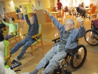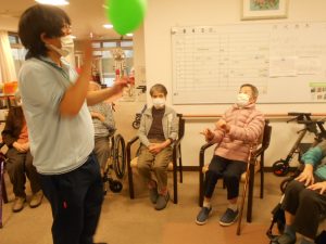 こちらは、午後のレクリエーションの時間です。風船バレーをしているところです。