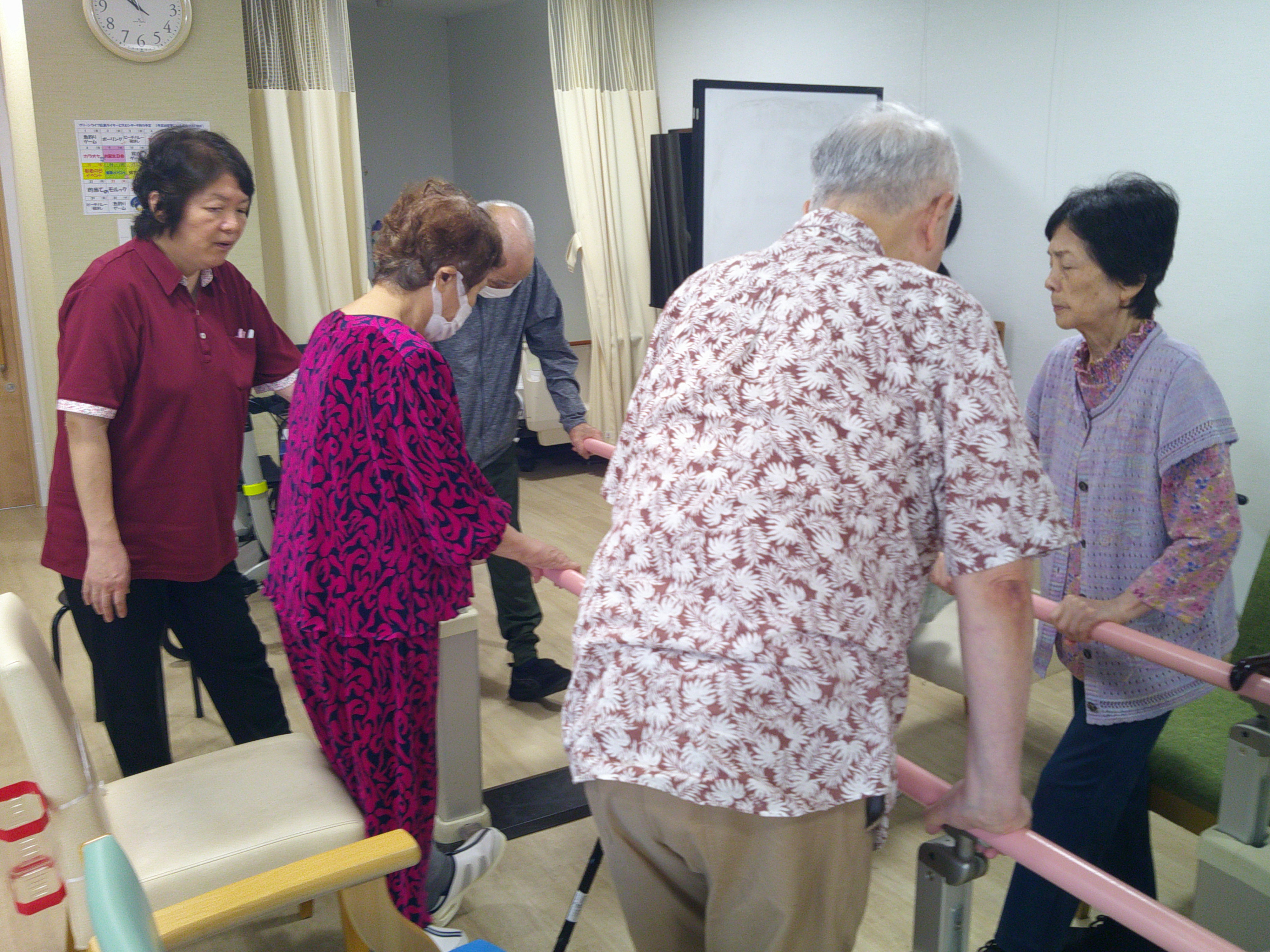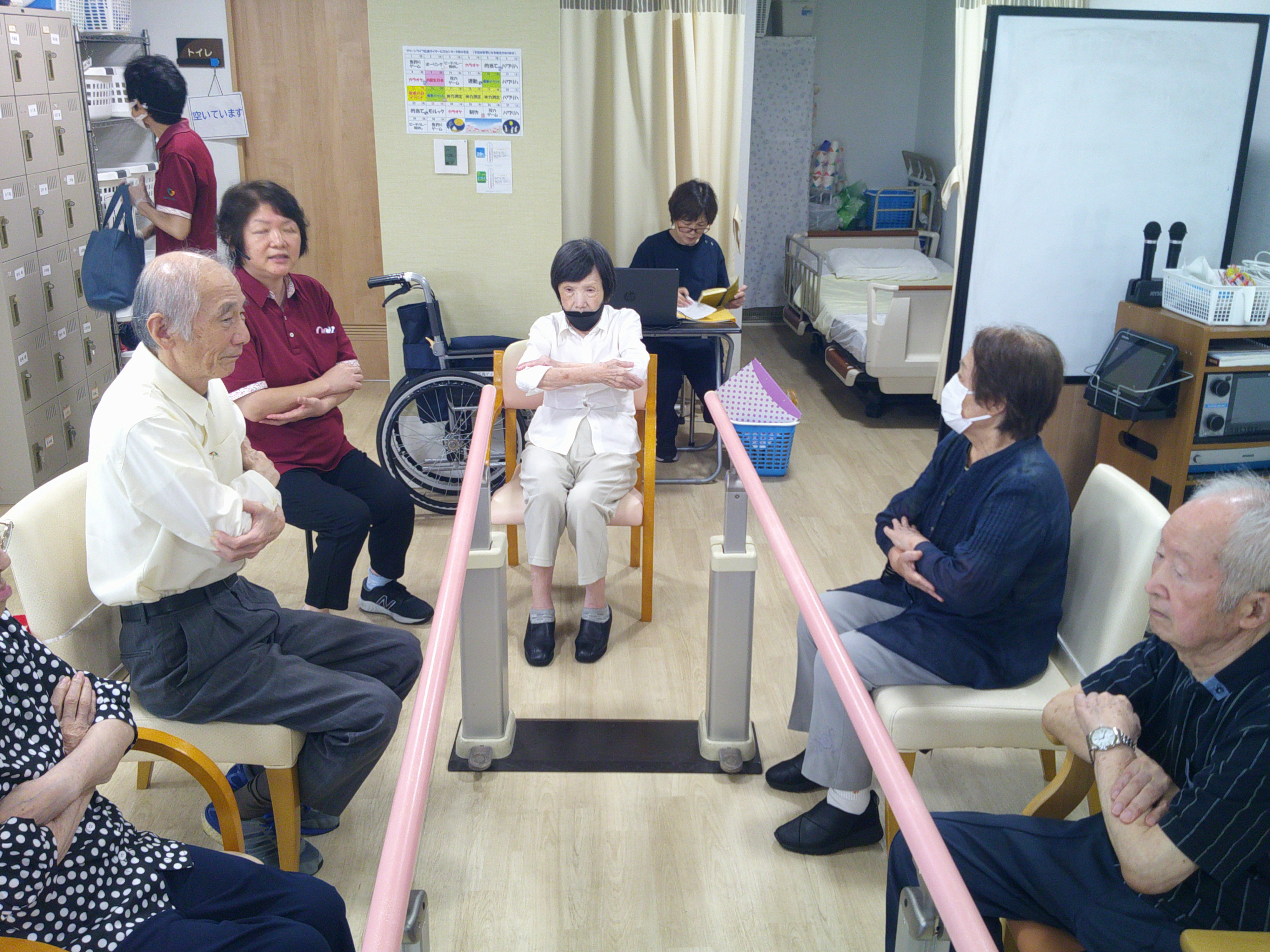 こんにちは、デイサービスです。今日の音楽レクは前半は「あんたがたどこさ」「むすんでひらいて」などの子どもの頃によく聞いた歌を歌いながら「さ」や「て」などの特定の文字のところで手を叩く、両手を上げる等の簡単な動作をするゲームを行いました(^^♪ 後半はカラオケだったのですが、普段は楽しそうに歌を歌っている方々がマイクを渡しても受け取ってもらえず。マイクは恥ずかしいとのことでした(>_<) 唯一、S様だけが「また私~?」と言いながら知床旅情、ブルーライトヨコハマなどをマイクで楽しそうに歌ってくださいました♪S様盛り上げてくださってありがとうございました!