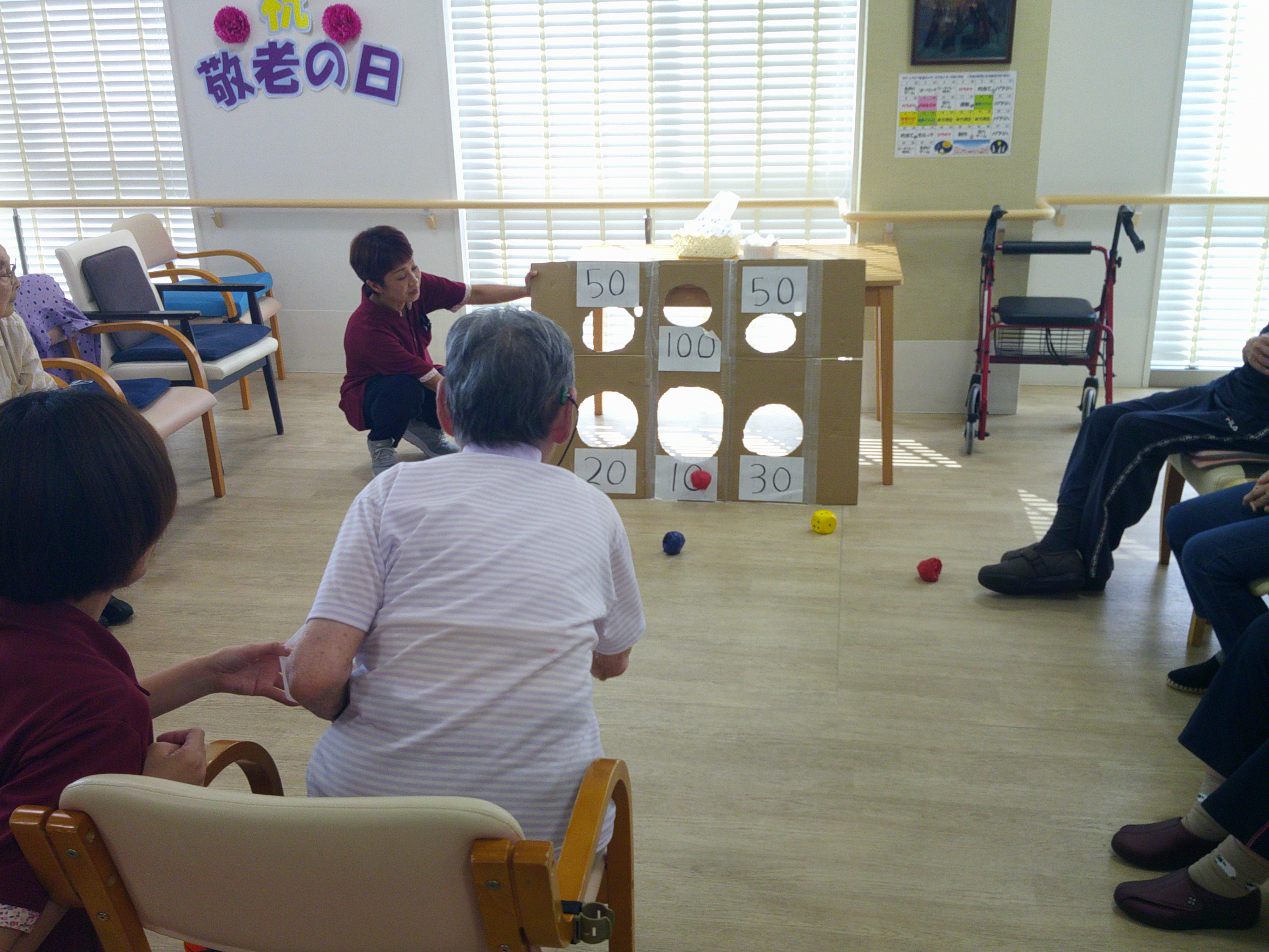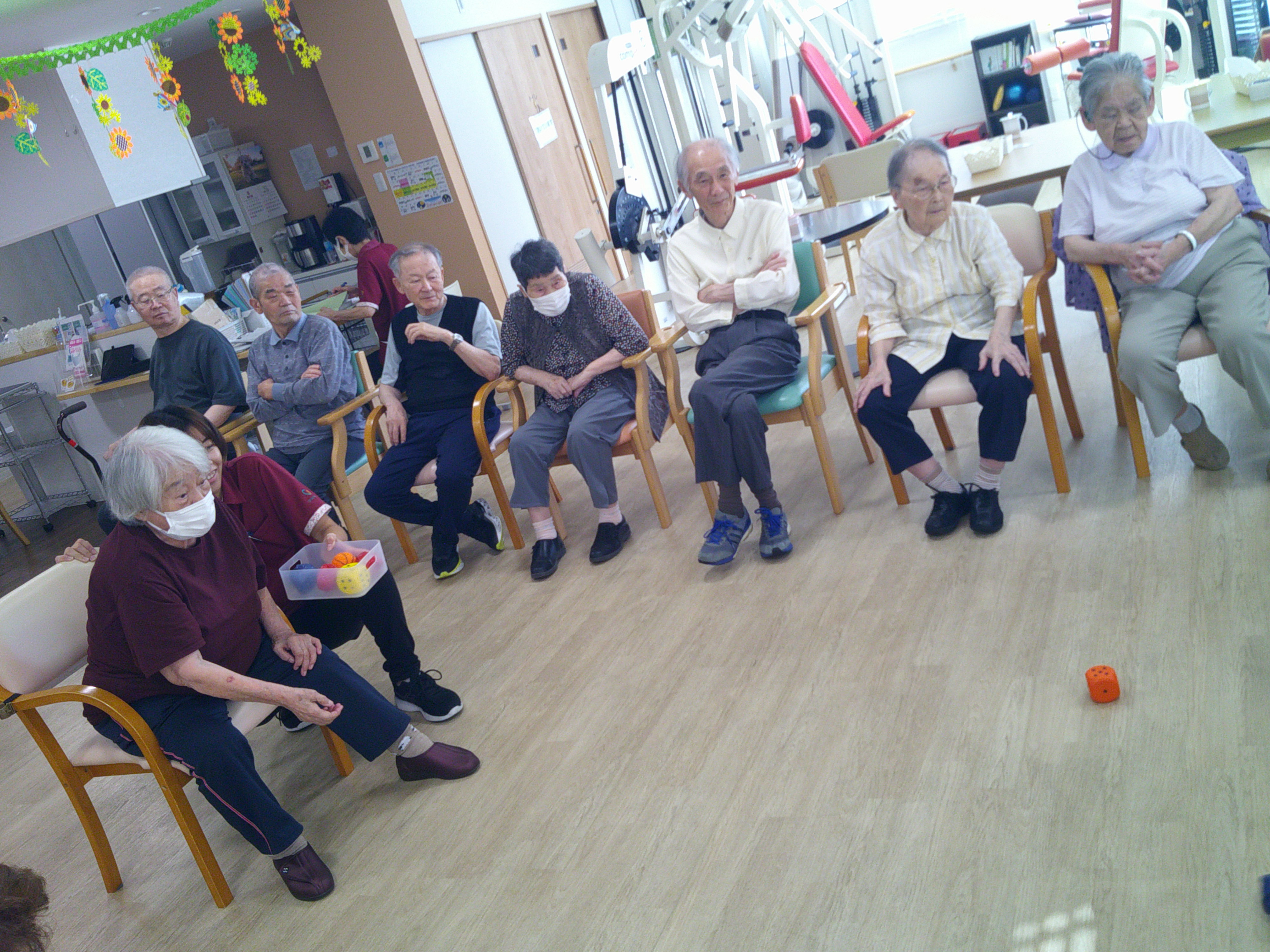 こんにちは、デイサービスです。今日のゲームレクはパターゴルフでした(^^♪1~9の数字が書いてあるボードに向かって重さのあるボールをパターで打ってもらいました。ゴルフやゲートボール経験者の方もいらっしゃいますが、少し勝手が違うようで別のコツがいるとのことでした(@_@)得意な方はご自分の順番でないときも「もう少し力を入れた方がいいよ」「右に曲がりがちだね」などアドバイスをしてくださいます。合計点数の計算もご利用者様にしていただくので脳トレにもなります。頭も体も使って有意義な時間が過ごせました。