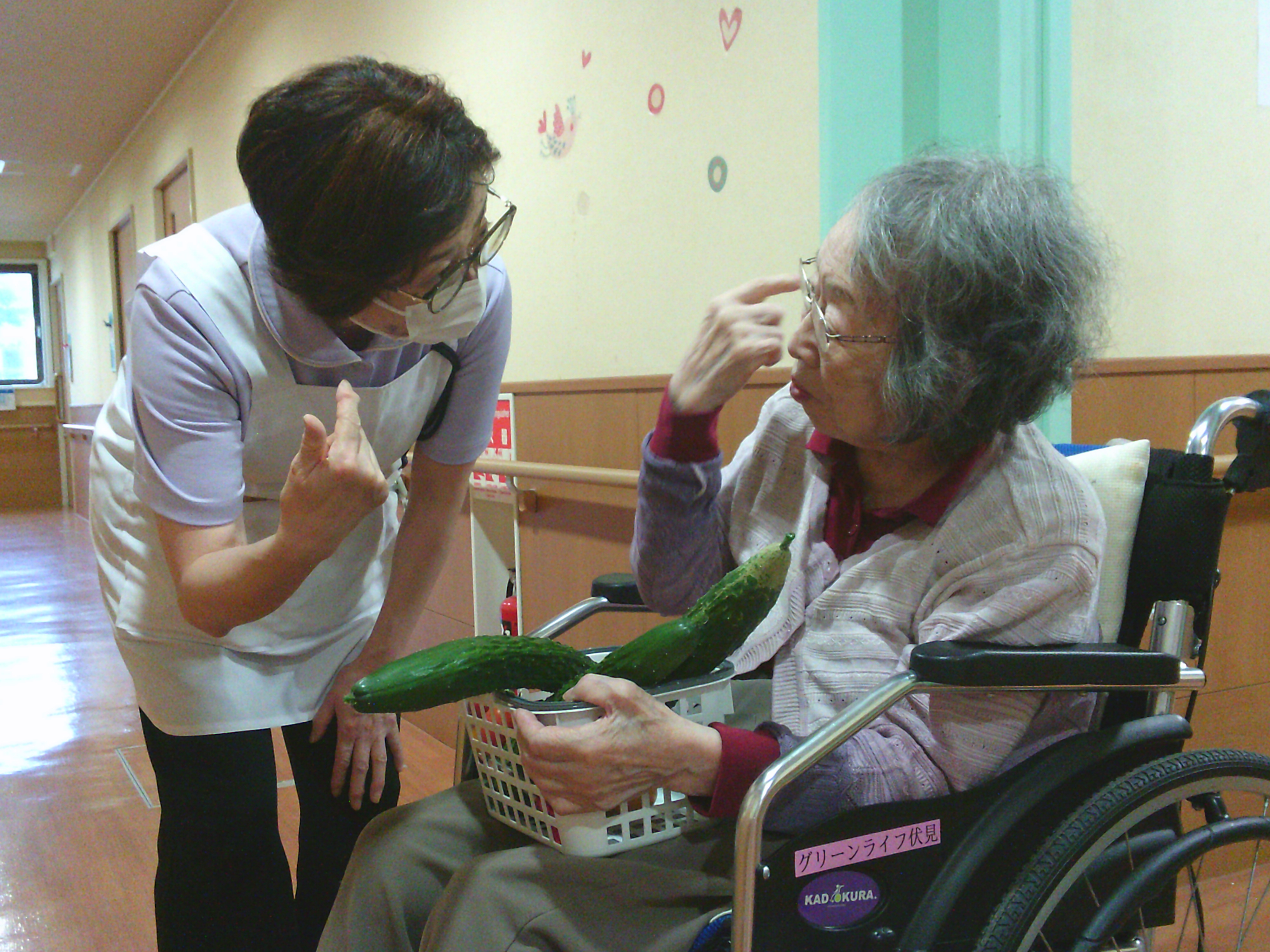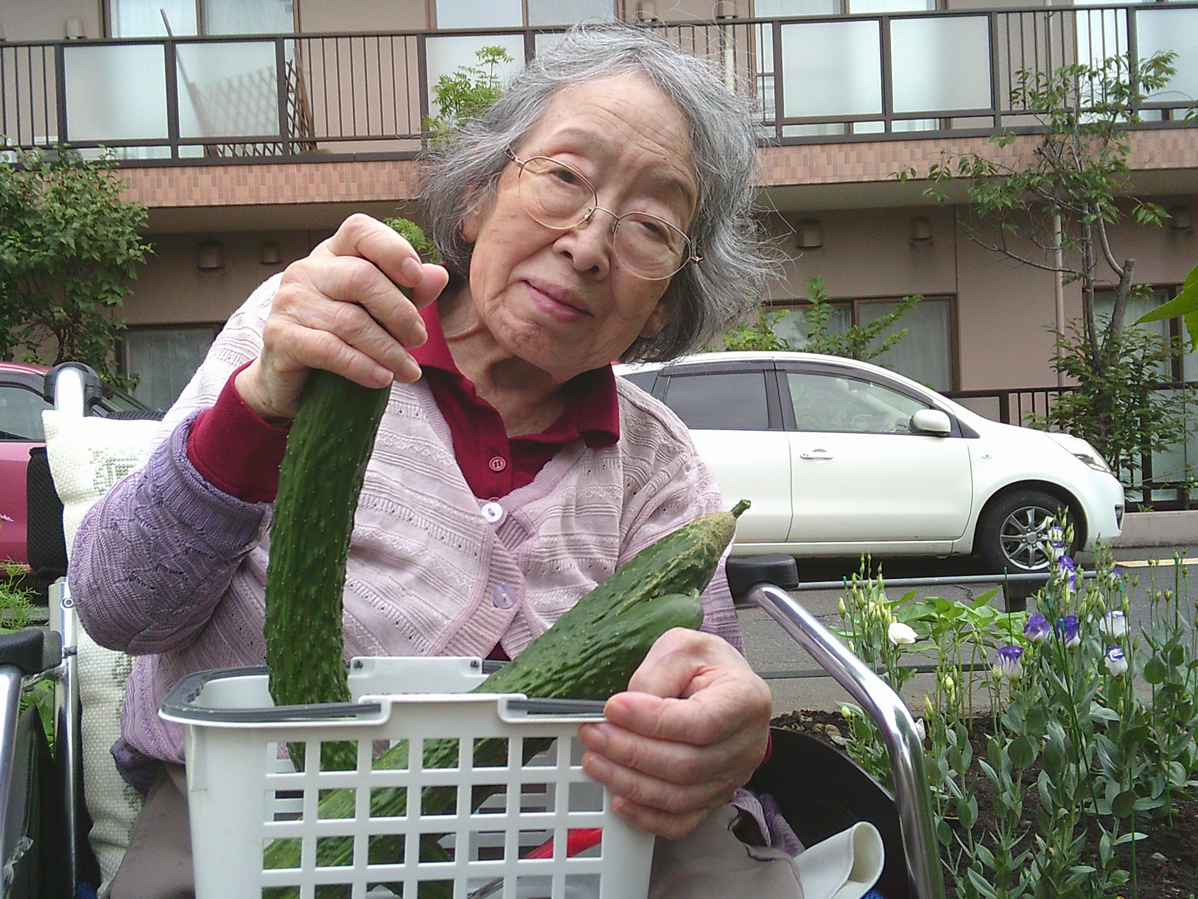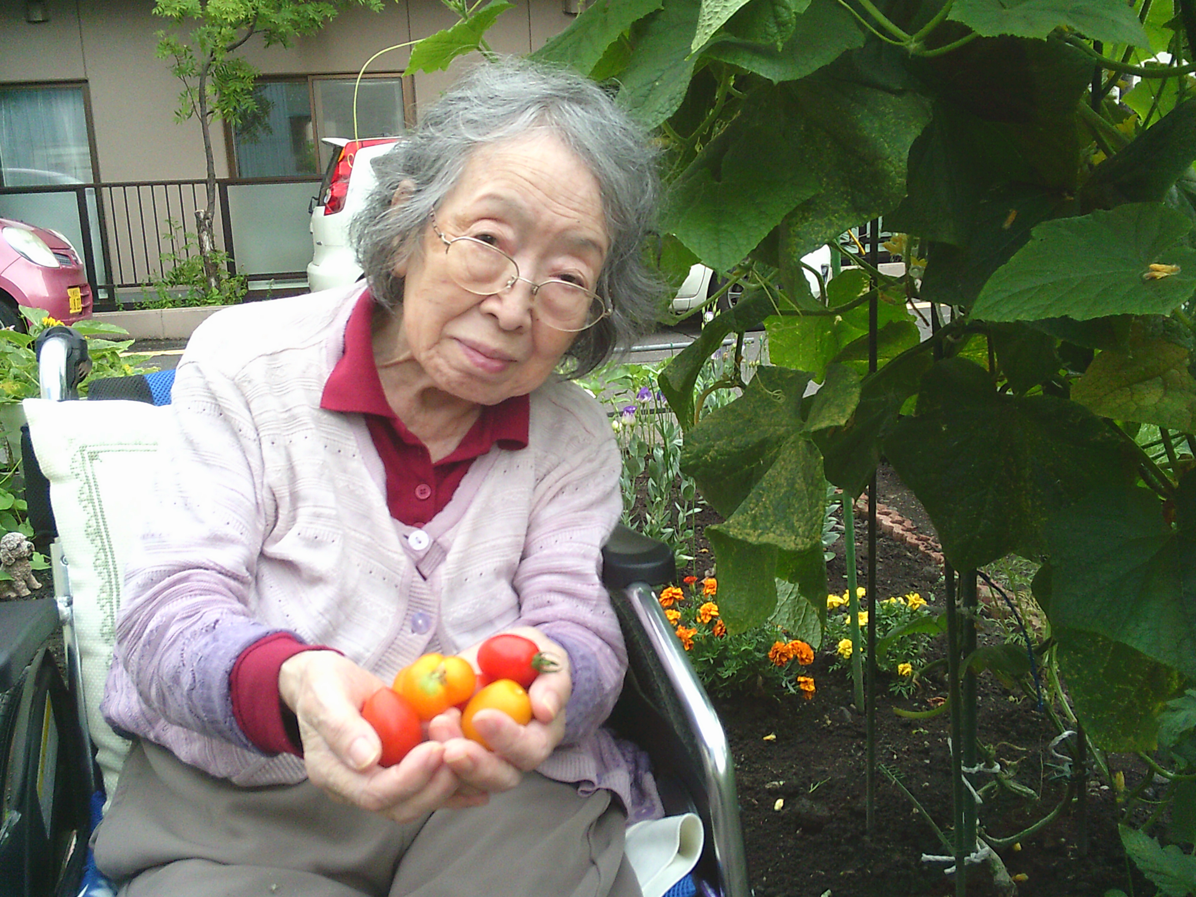 畑を見たらまたとんでもなく成長しているキュウリ、赤く色ずいたミニトマトを入居者様と