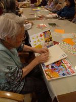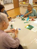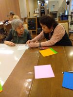 折り紙の本を見ながら折ったりお隣の方にお手伝いしていただいたりスタッフと一緒に折ったりしながら色々な色の星が完成しました。七夕の笹に飾りつけます。その後は短冊に願い事を書いていただき今日は終了となりました。