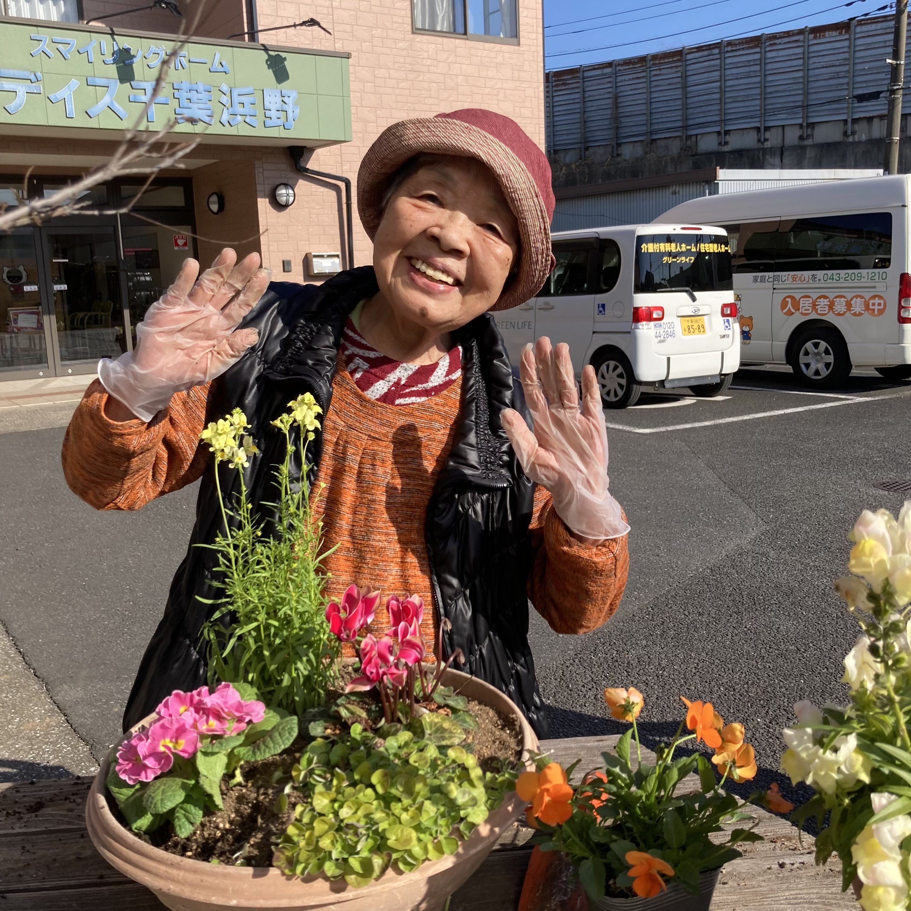 完成した鉢植えは玄関に飾り、メディス千葉浜野の入り口を明るく彩っています!