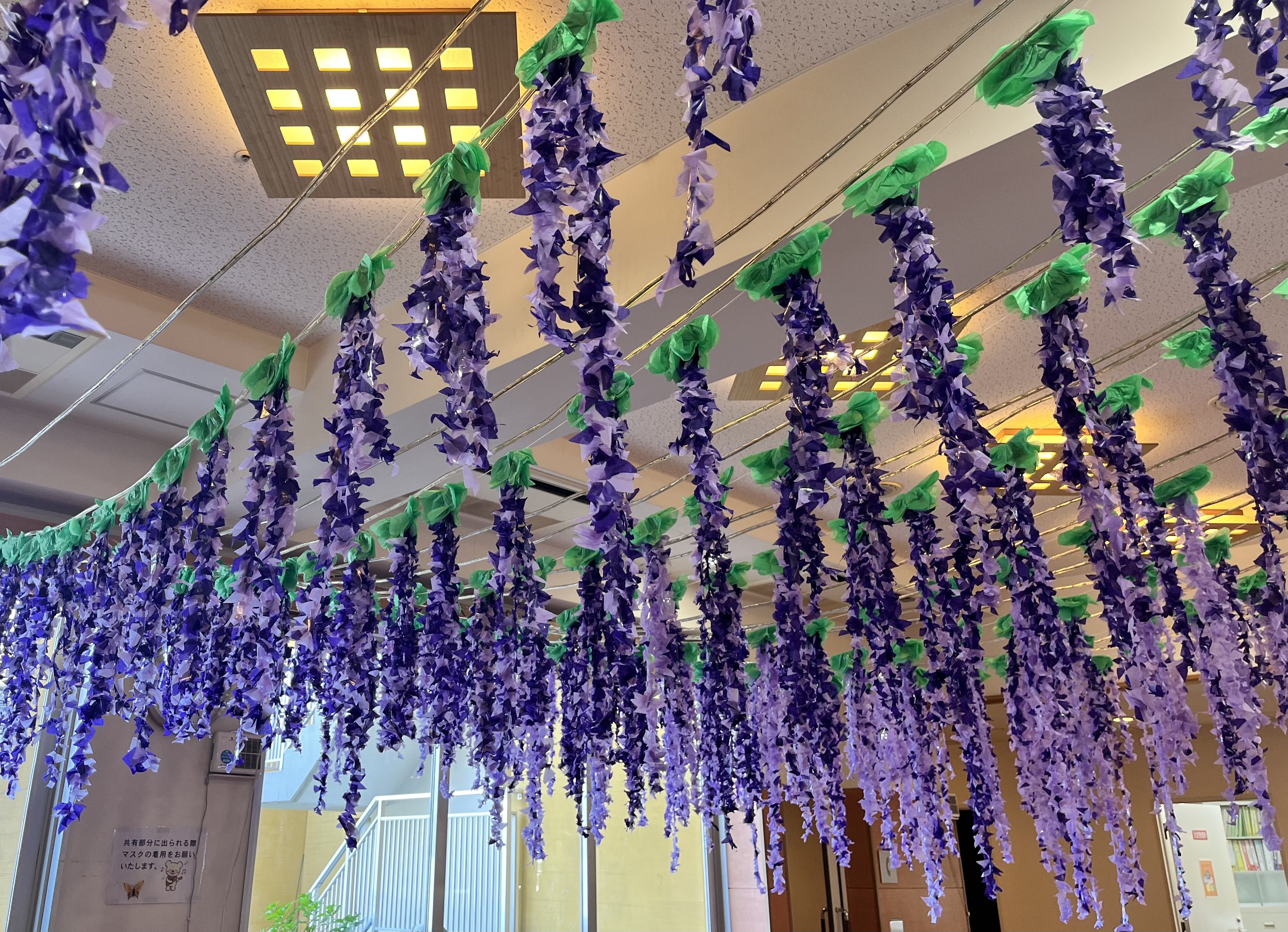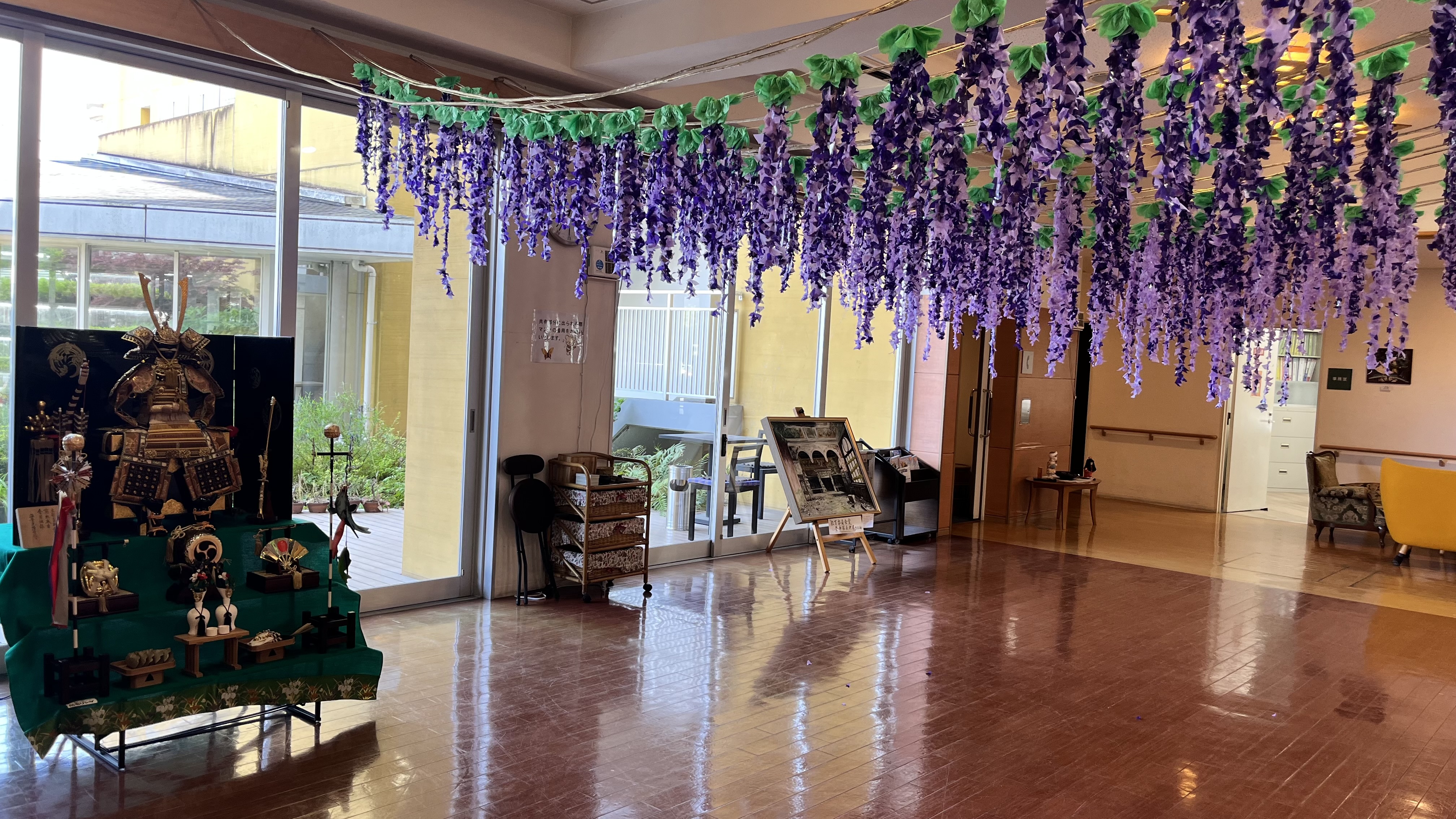 機能訓練指導員がご入居者様と作成した「子供の日」のボードが飾ってあります。兜や🎏が折り紙で折ってあります。