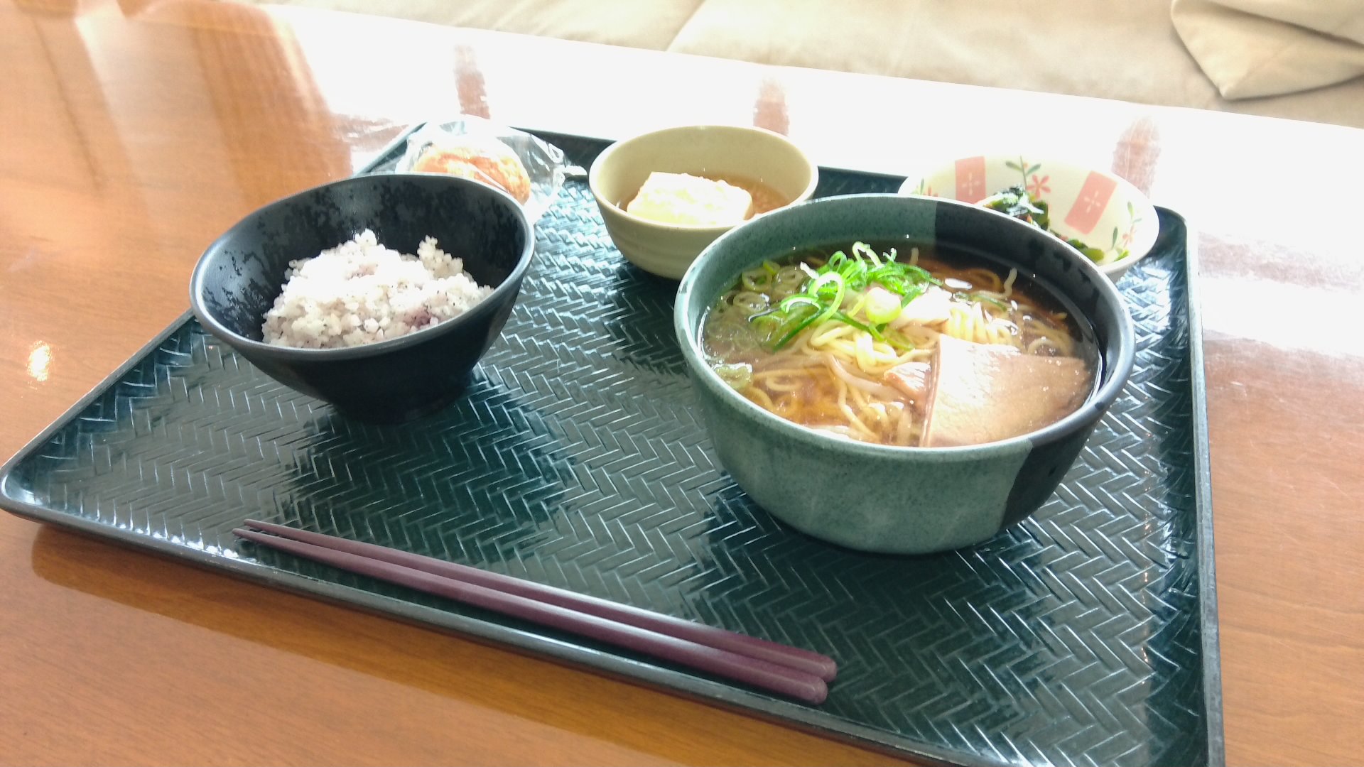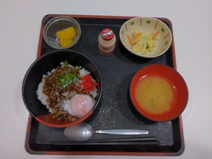 本日の昼食は「牛カルビ丼」「味噌汁」「酢味噌和え」「フルーツ」「乳酸菌飲料」でした。「味がしっかりついてて美味しいよ」と好評でした。