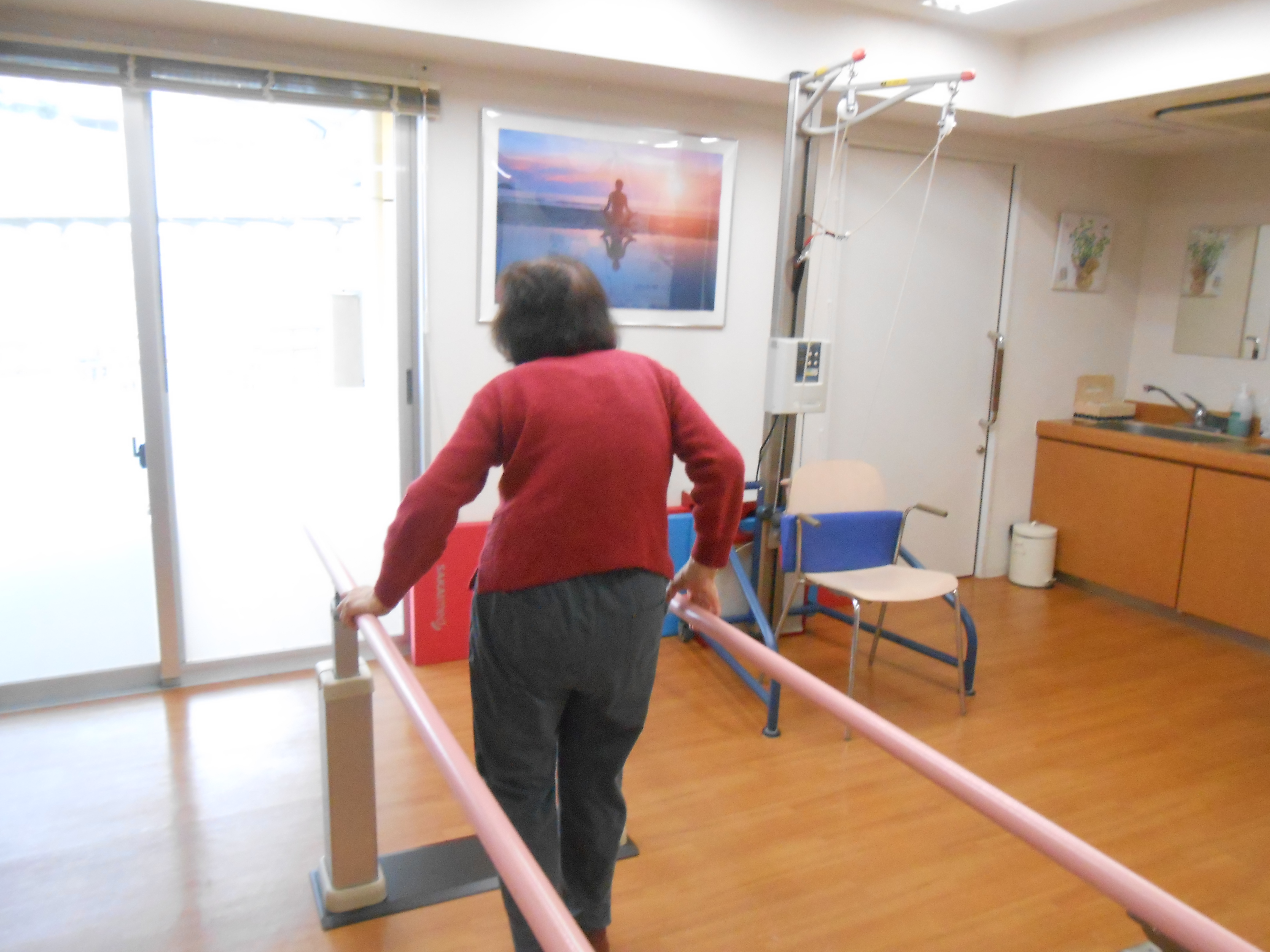 施設の玄関は午後になると日差しが差し込み