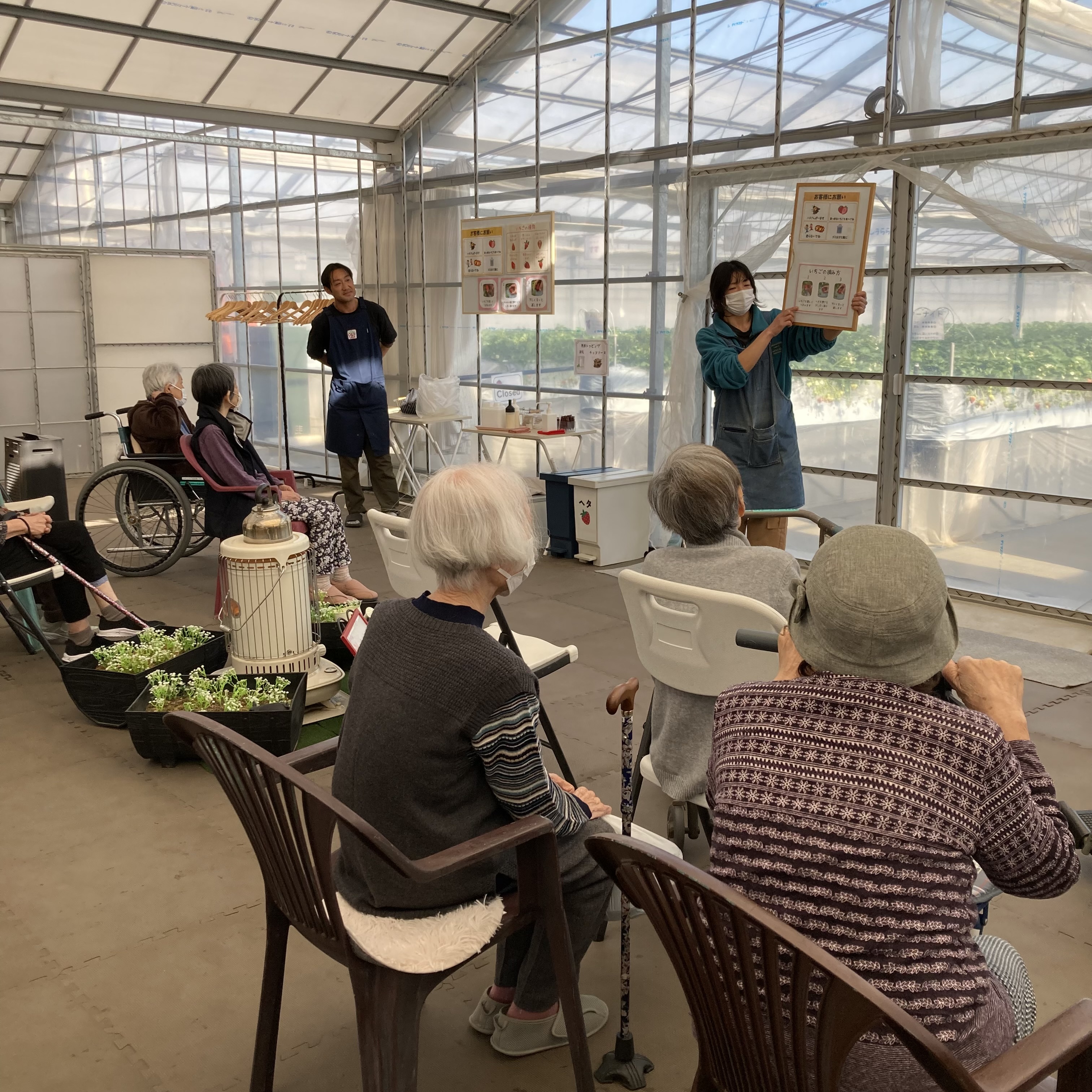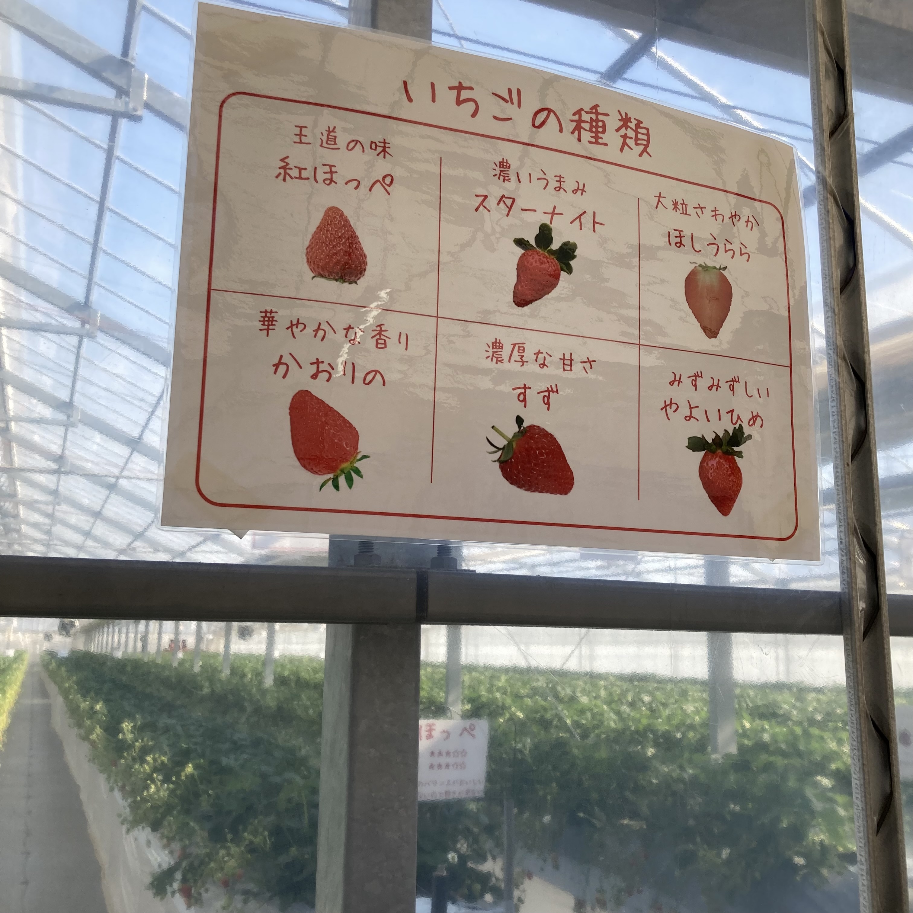 水耕栽培で育った6種類のイチゴを前に、摘み方や注意点を説明して頂き、いざイチゴハウスへ‼️