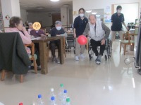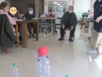 本日のゲームレクはボーリングを行いました。こちらでは空のペットボトルに重しのビー玉を入れたものをピンに見立てて行います♪ ご利用者様の皆様上手に投げてピンを倒していました(*^-^*) ボールはゴムボールで行うので当たっても痛くないのですが、思ってもいない場所に飛んで行ったりと「へそ曲がりなボールだね」と仰る方もいらっしゃり笑い声も聞こえてきました✨最後に体を傷めないようにストレッチも行いました。
