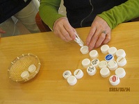 今日は、皆様で「キャップはさみゲーム」を行いました。まず、ペットボトルのキャップを洗濯ばさみで挟みます。その挟んだキャップを、挟んだままザルの中に入れていきます。20個用意されたキャップを早くザルの中に入れた方が勝ちです。トーナメントで行いました。女性の方が手先が器用かと思いましたが、優勝したのは男性でした。皆様、「これは指先の運動になるね」等と言われ、集中してされていました(^-^)
