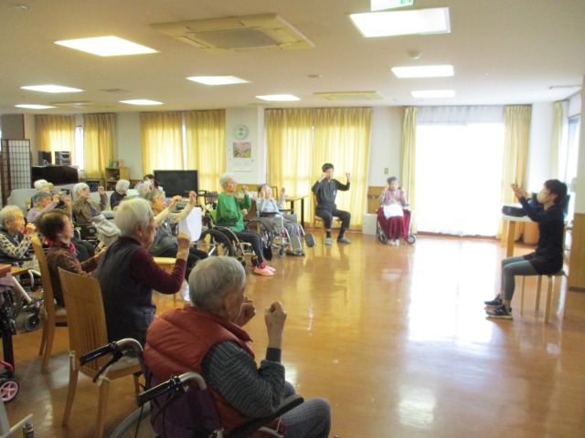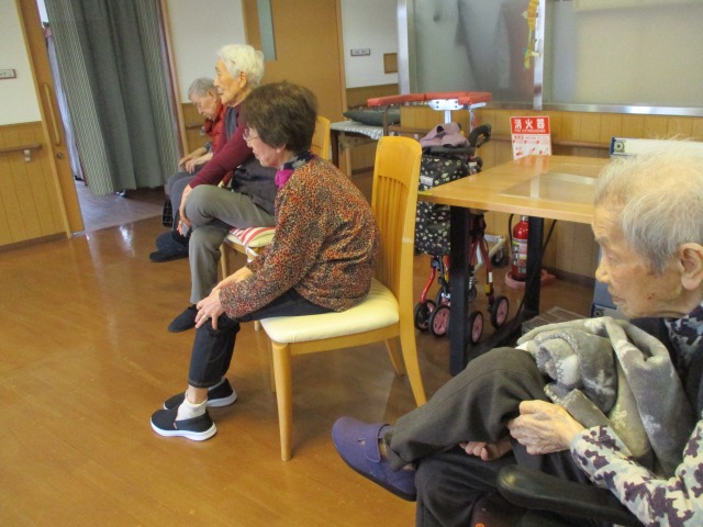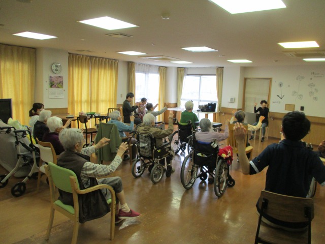 月に一度の大人気体操レクリエーション‼【はっぴー体操】が今月も開催されました(*^-^*)たくさんのご利用者様が今回も参加してくださいました‼スタッフも一緒に30分一緒に行いましたが結構キツイ💦(;”∀”)ご利用者様も先生についていこうと一生懸命頑張っておられました。指で数を数えながら足を動かす…難しい‼ケアマネージャー「ちょっと待って~💦」と少し慌てながら、なんとかやり切りました( *´艸`)ご利用者様も高い位置まで足が上がっていて、すごい‼と先生に褒められていましたよ(*^▽^*)