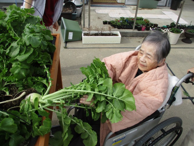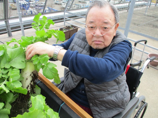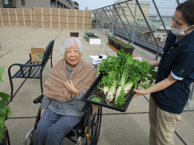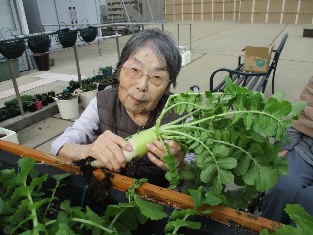 はぴね屋上菜園では【大根】の収穫時期を迎えました‼ご利用者様に屋上に集合していただき、良く育った大根をお一人ずつ引き抜いていただきました‼スポッと抜けるものもあれば、中々抜けない大根もあり一生懸命、掛け声をあげながら皆様とても頑張ってくださいました(*^▽^*)収穫出来た大根は看護師さんの手により美味しいお漬物になり、ごはんのお供にと夕食時に皆様のもとへ(⋈◍>◡<◍)。✧♡スタッフも食べましたが、苦みが一切なくおいしかったです(*^-^*)