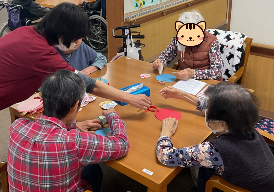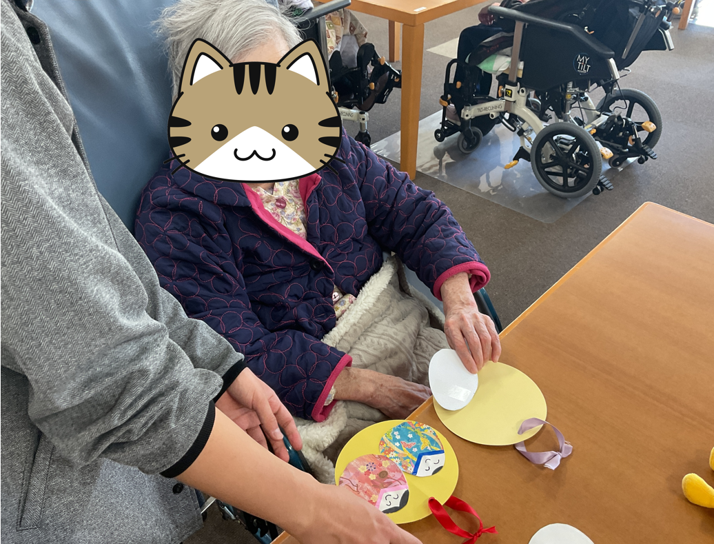 スタッフが見本を作って見せ、入居者様が同じように好きな台紙に御内裏様と御雛様を貼付けて完成です。