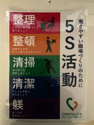 グリーンライフグループでは、「5S活動」を行っています。”整理” ”整頓” ”清掃” ”清潔” ”躾” の5つのSを取り組んでいます。