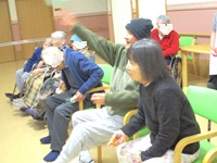 入居者様がお手玉を投げる際、「札まで届くかな…」と心配していた担当スタッフの思いとは裏腹に、目標物をしっかり見据えて力強く投げ込んでいた入居者様たち。笑