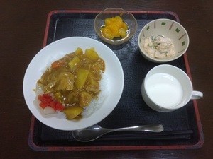 「ご飯」「ポークカレー」「たらもサラダ」「みかん」「牛乳」