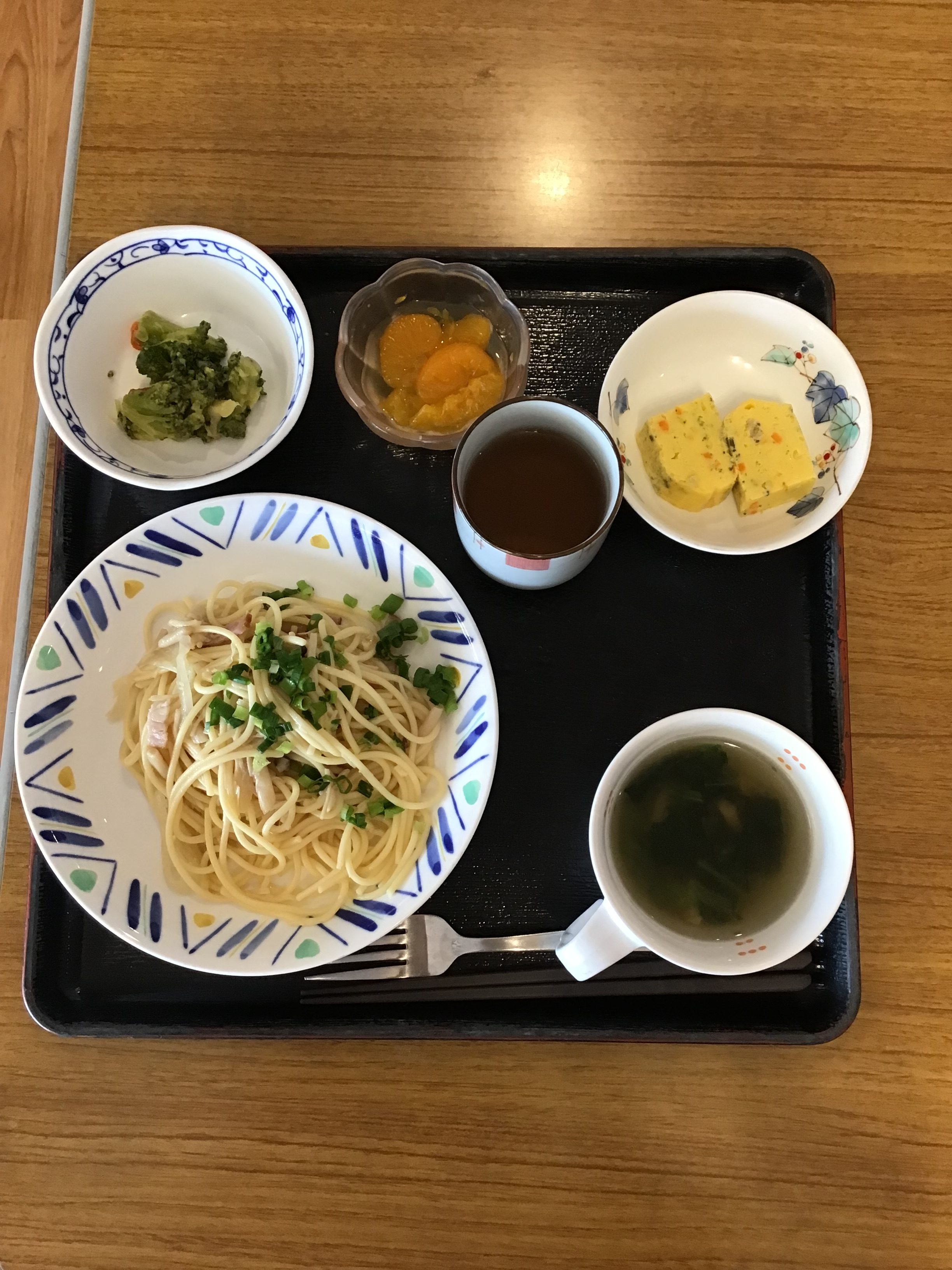 献立のメニューは、ベーコンきのこスパゲティとブロッコリーのチーズ焼き、