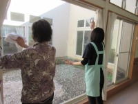 スタッフが窓ガラスを拭いていたところ
