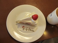今日のお誕生日のK様。恥ずかしがり屋さんなので写真を控えさせていただいています。「ショートケーキ」がお好きとのことで喜んで召し上がってくださっています。