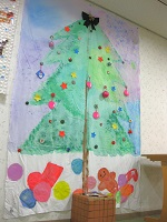前に入居者様と一緒に作成した大きなクリスマスツリーの壁飾りをホールに飾りました。