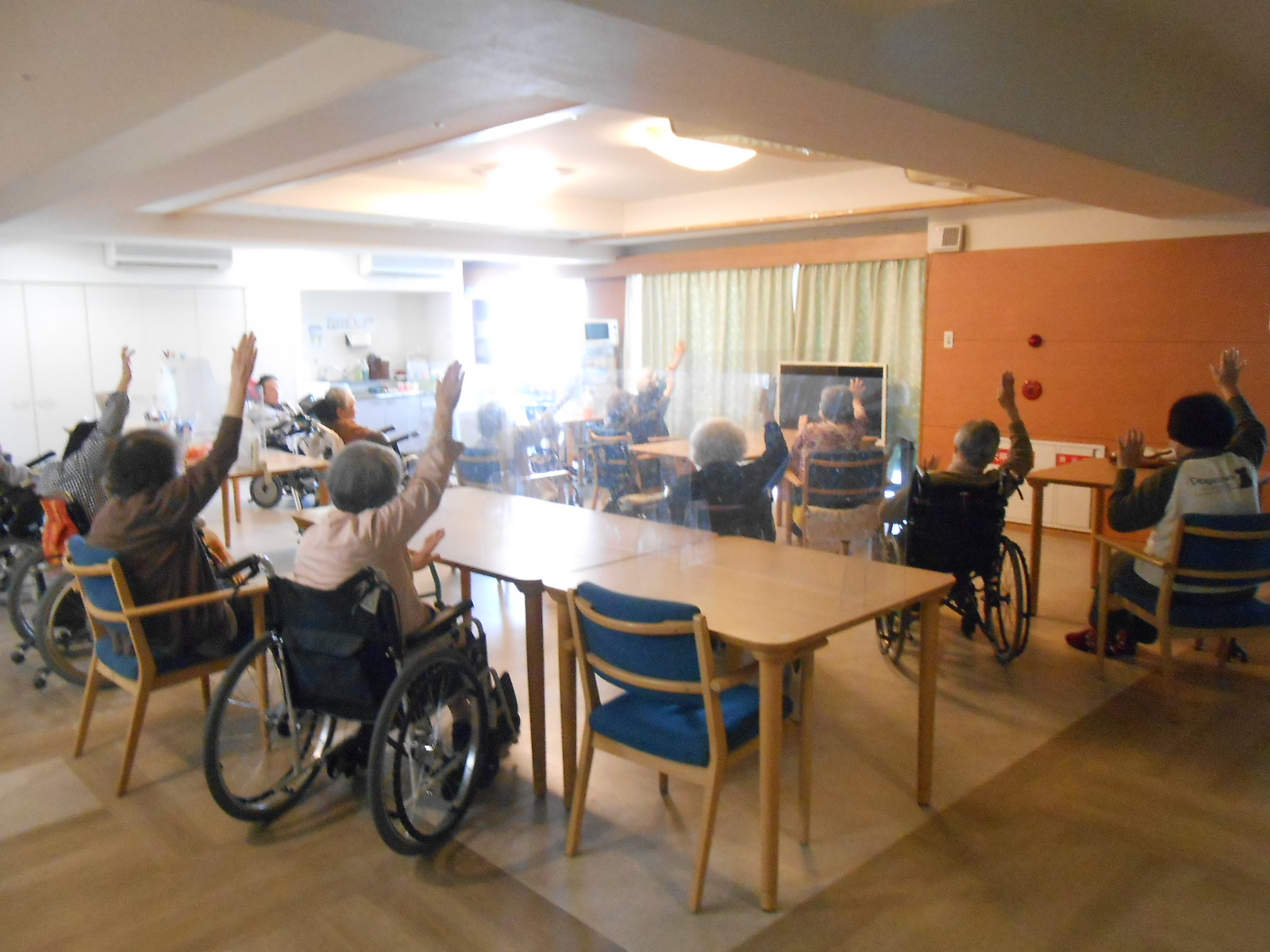 皆で一緒に楽しみました!体を動かすのはやっぱり皆さん大好き、TVに映る映像を見ながら、