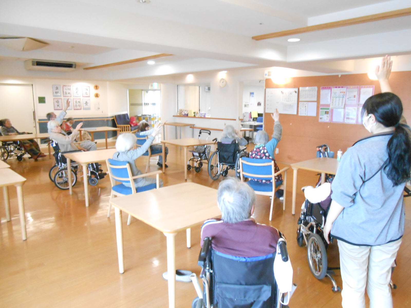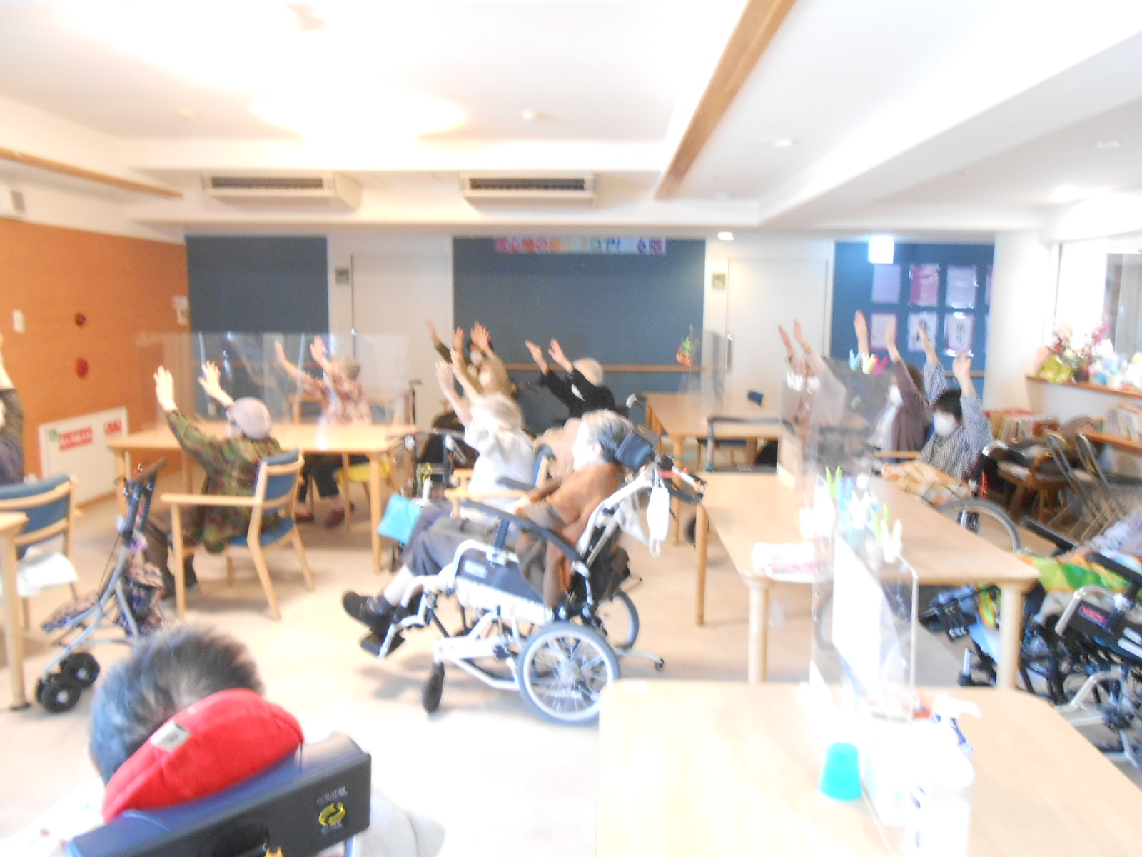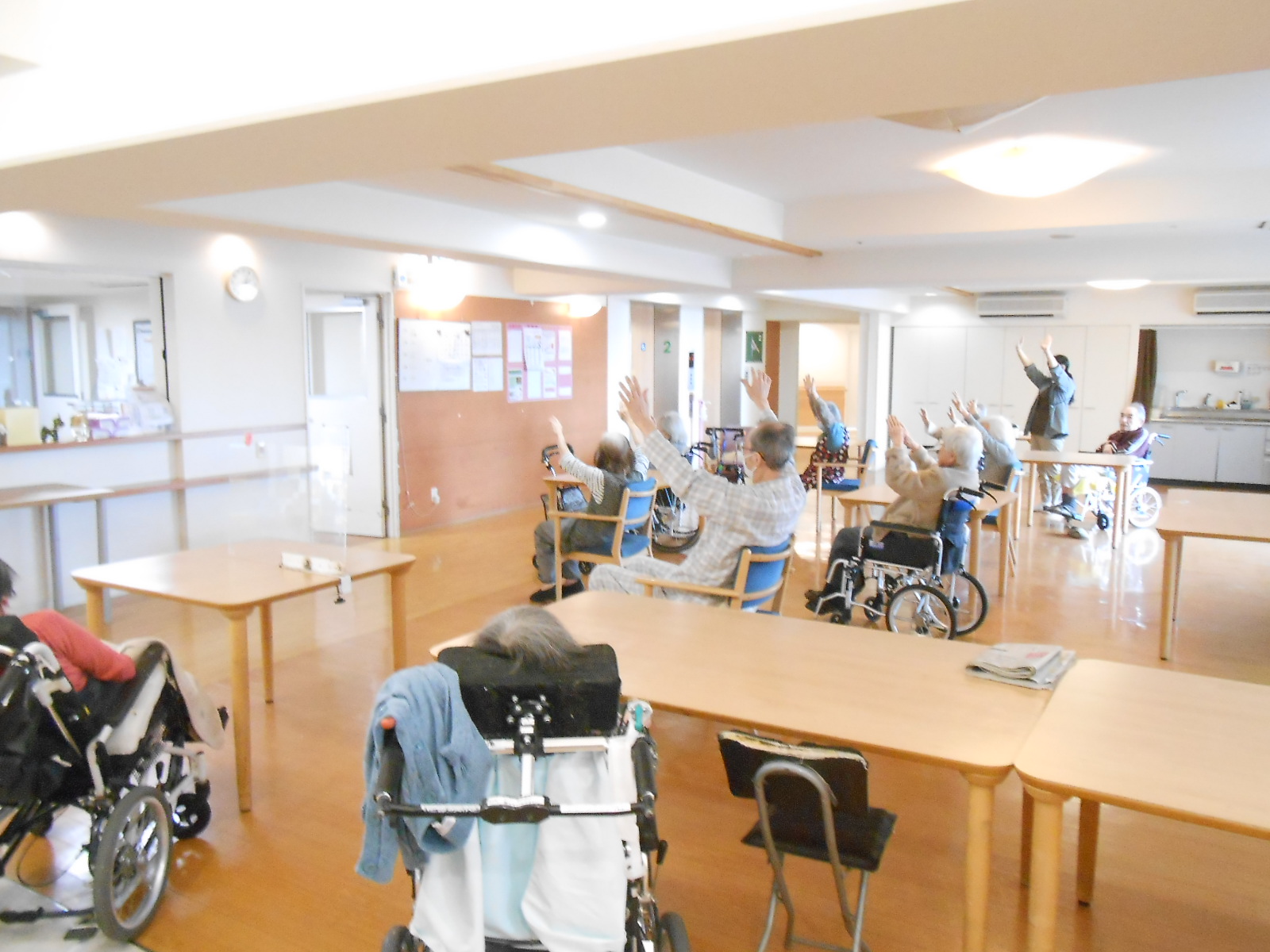 本日は、体操や脳トレといったレクリエーションをしてくださる方が施設に来られ、
