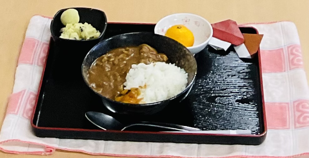 メニューは、カレー、さつま芋サラダ、ノンアルコールのビールとワイン