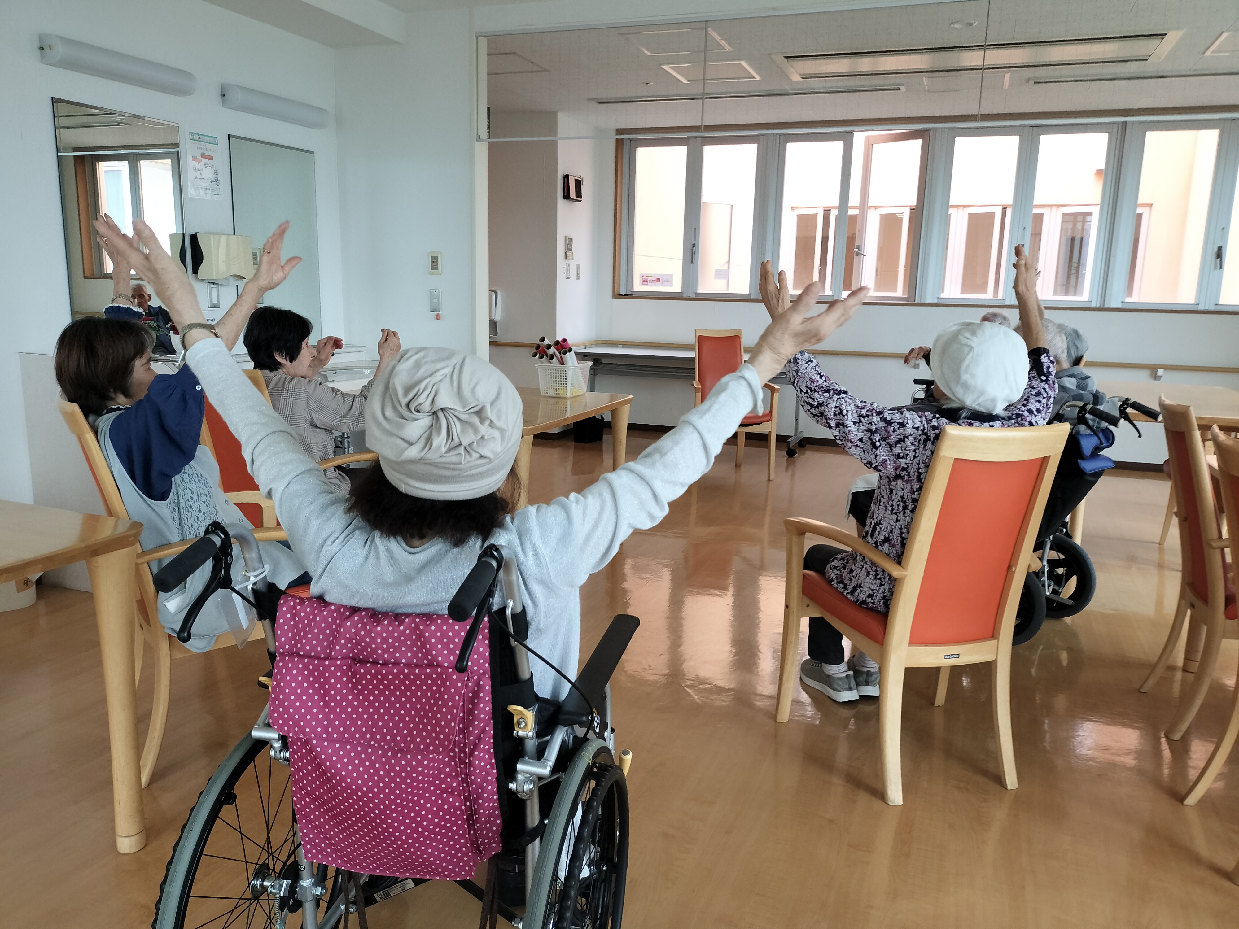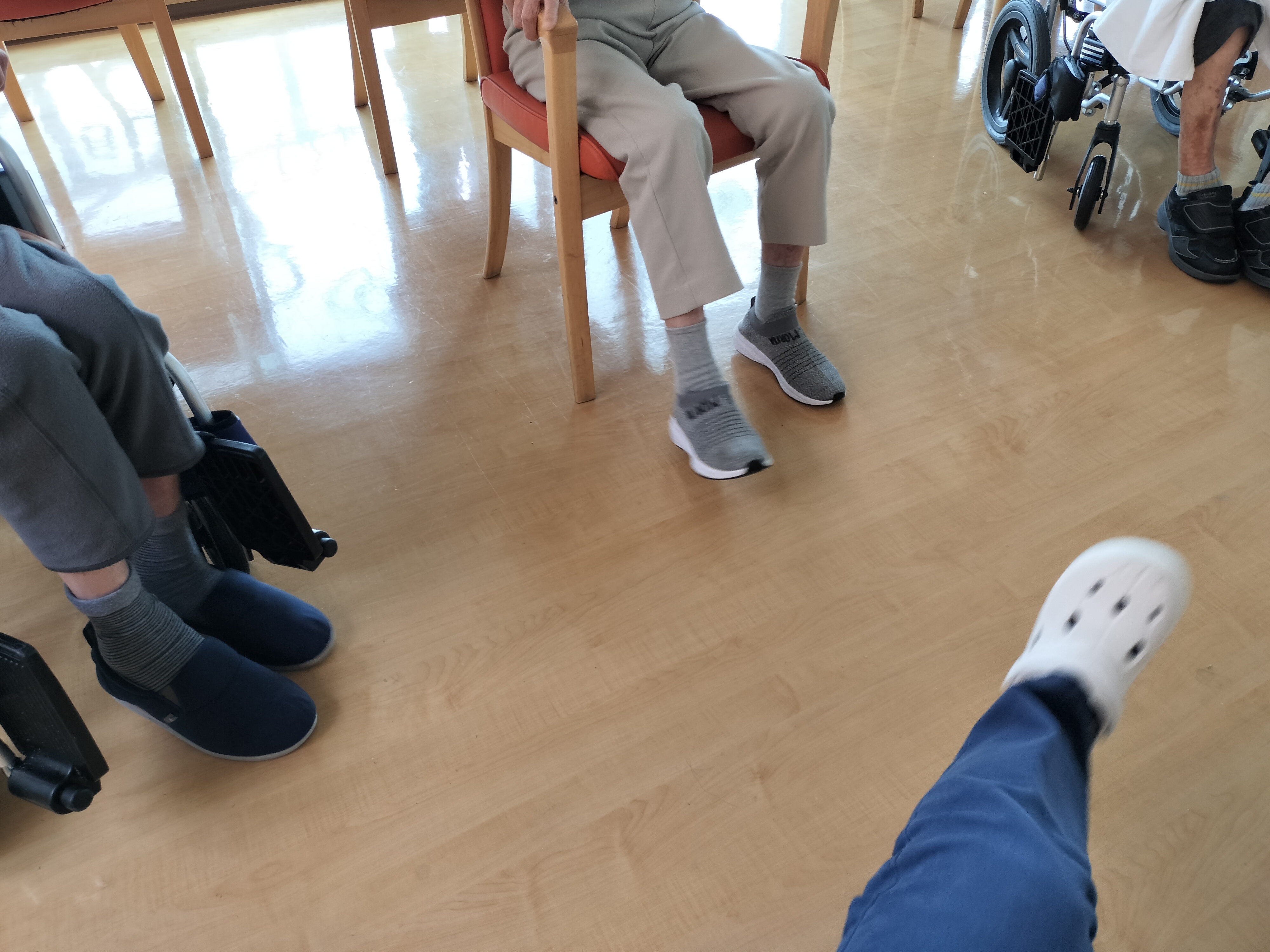 その他、おなじみ転倒予防のための太ももの内側・外側の筋肉を鍛える足の運動や、歌を歌いながら拍子を取りつつ体を動かす体幹運動なんかもしっかりやって終了。