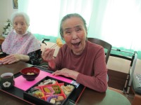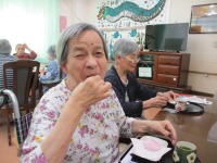 その後はおやつに紅白まんじゅうを食べていただきました。皆様、口いっぱいに頬張っておられ幸せそうな顔をされていました。