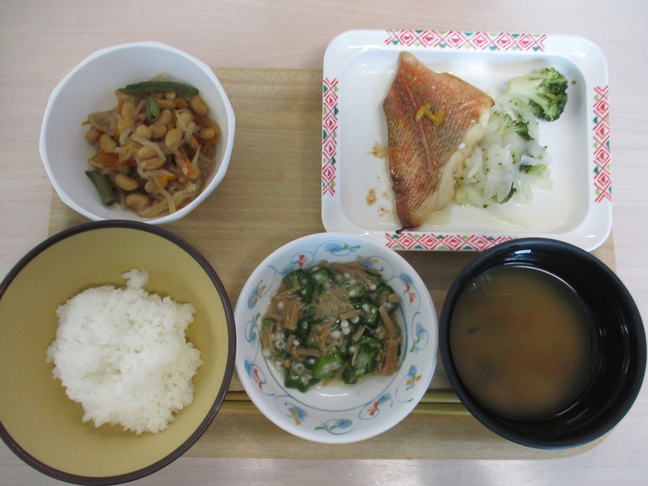 赤魚の幽庵焼き・オクラとなめ茸和え・切干と大豆の炒め煮・味噌汁