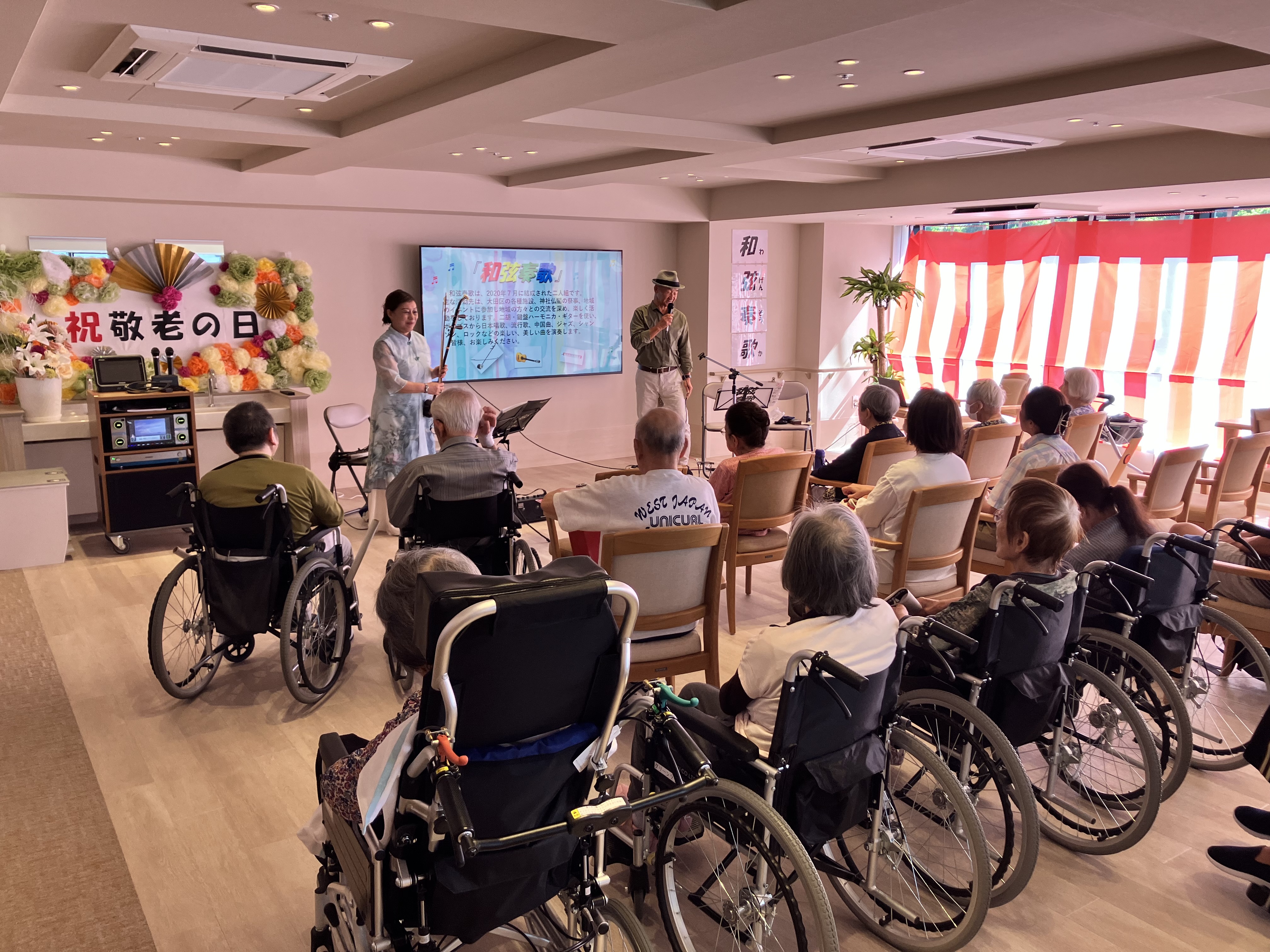 本日、敬老会を実施しました。地域のミュージシャン「和弦奏歌」のお二人を招いて、音楽会を実施しました。中国の二胡という楽器とギターによるコラボレーションで普段聞くことのない音色に皆さんうっとりとしていました。