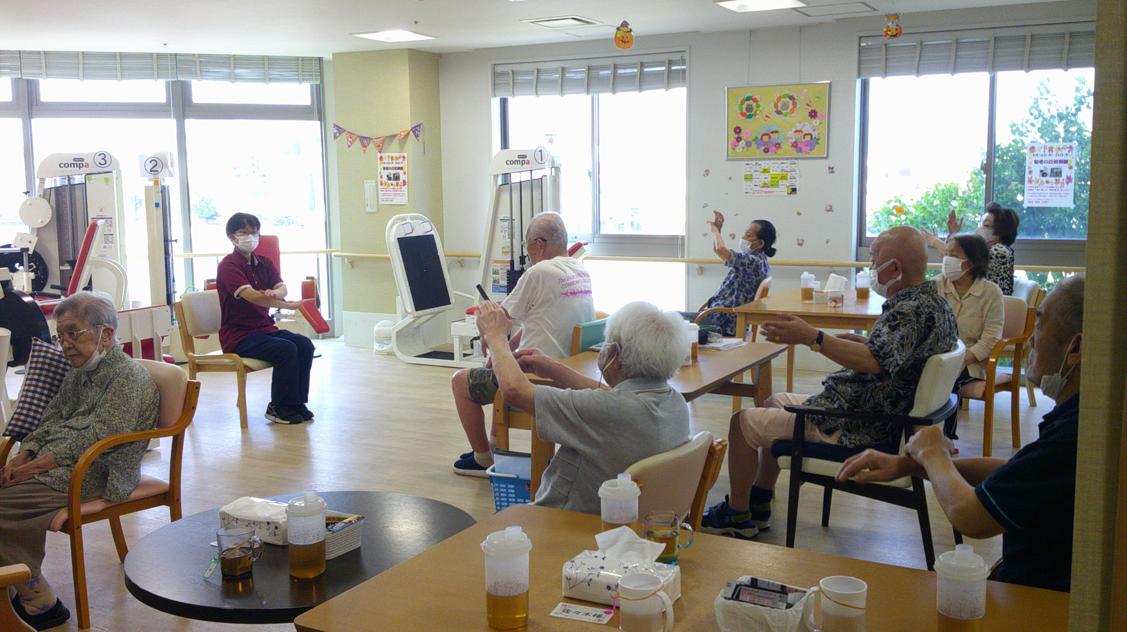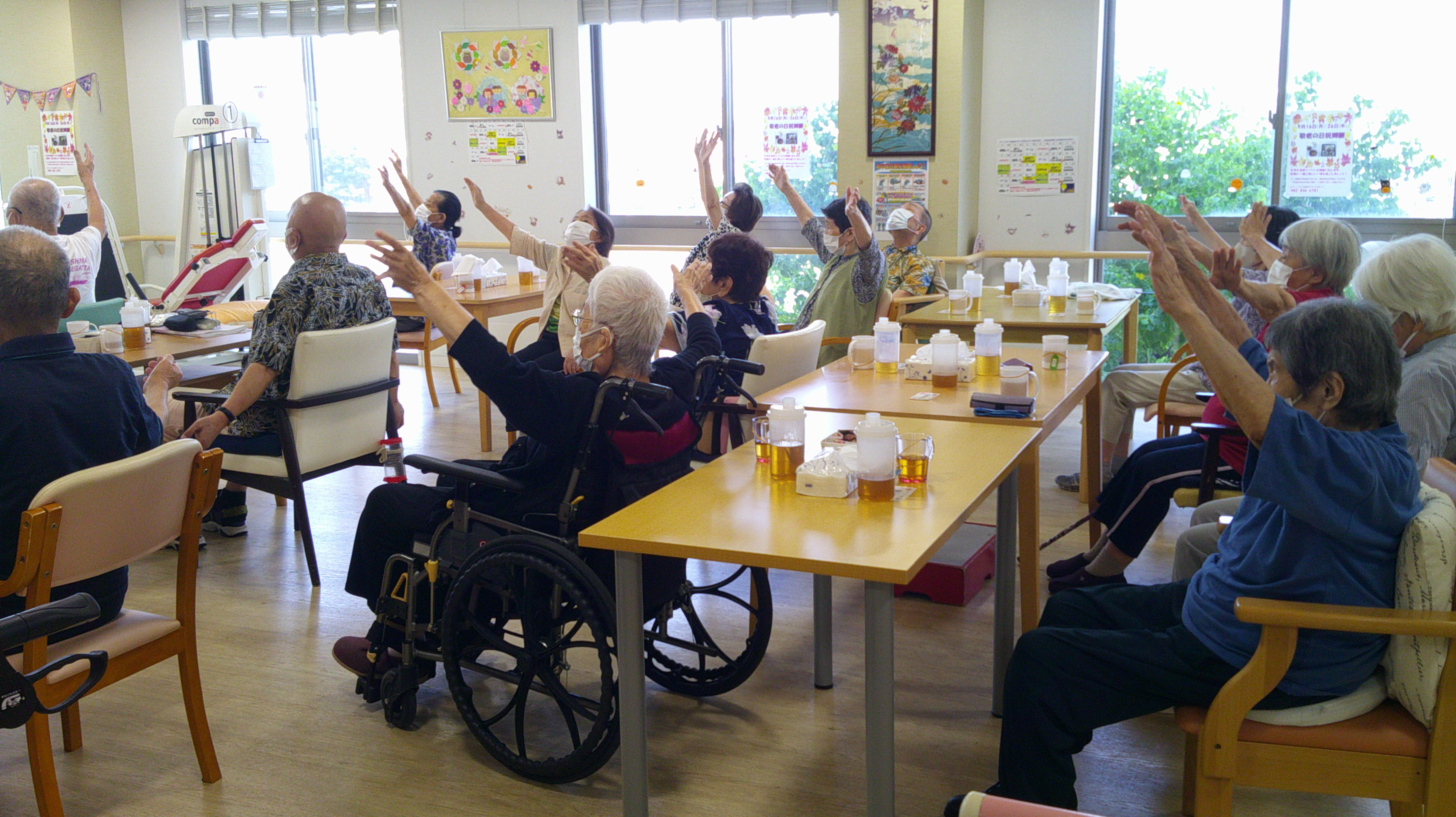 職員と一緒に楽しく体操をおこないながら、体操終わりには美味しいジュースを召し上がっていただいています(≧▽≦)