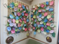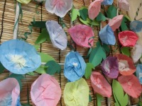 あさがお・・・・・色とりどりのあさがおは、絵の具を水でにじませて作りました。