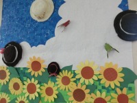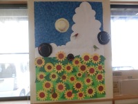夏のひまわり畑・・・・・夏の空によく見かける入道雲を大きく作りました。ちぎり絵で表現しています。