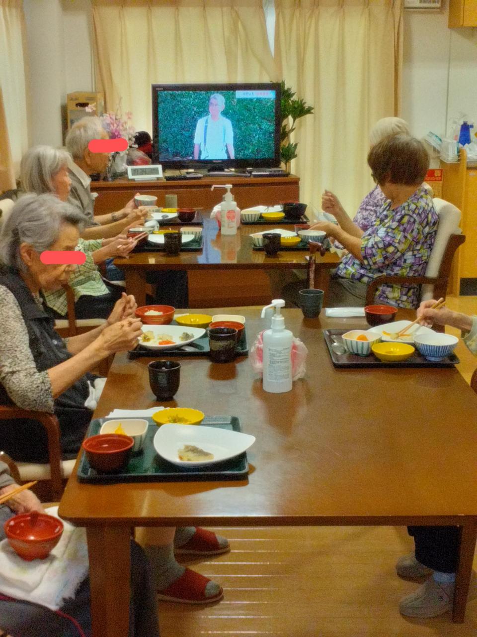朝食を終えた後、フロアのテレビをじっと見つめているM様。
