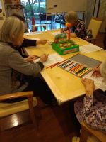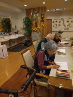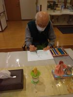 本日は介護川柳を行いました。前半にプリントしたたくさんの川柳を紹介して、後半でそれを参考にしてもらいながらご自身でも川柳を作って頂きました。難しいとおっしゃるご利用者の方には職員が隣でアイデアを出しながら取り組まれていました(^^♪