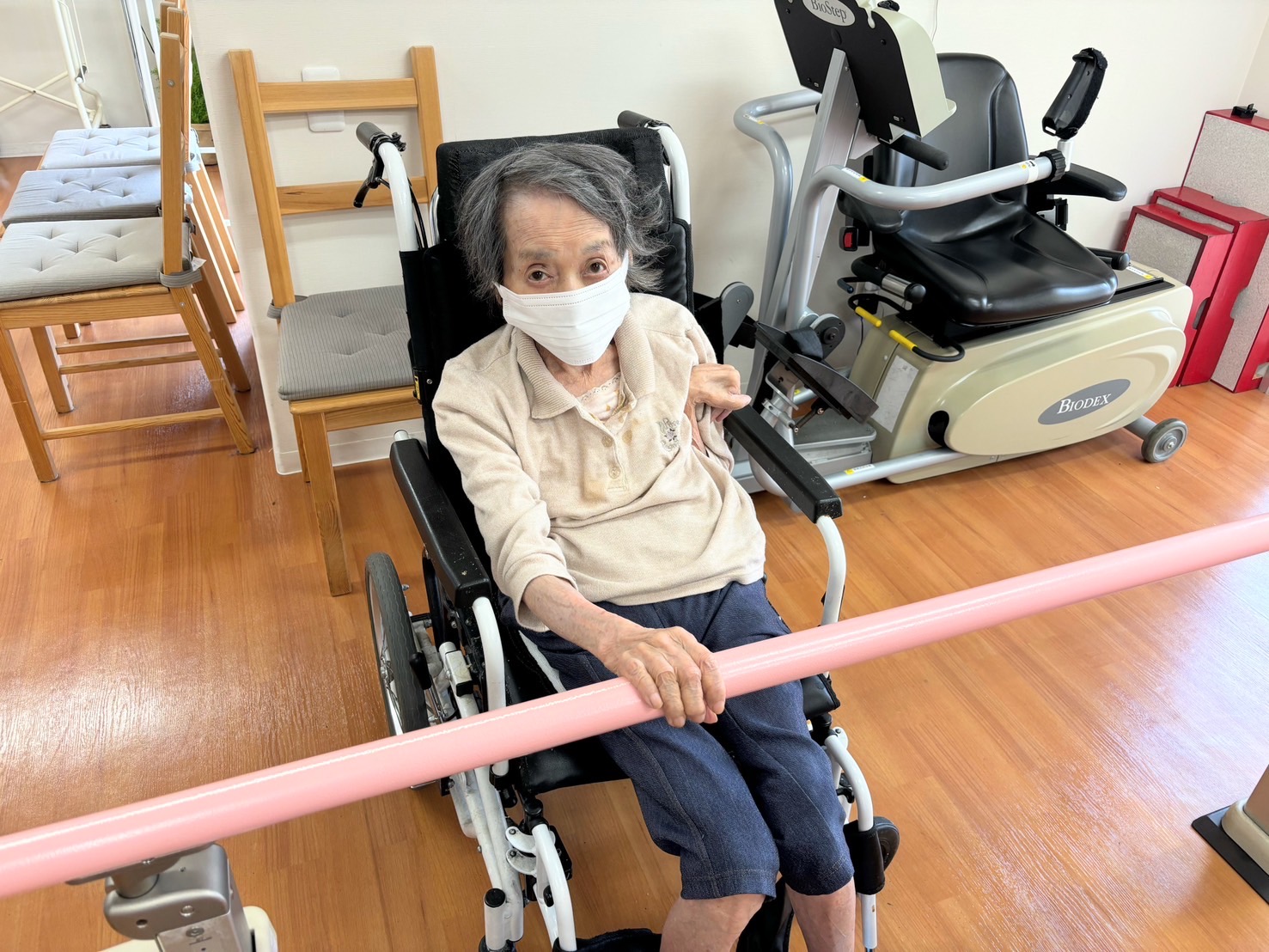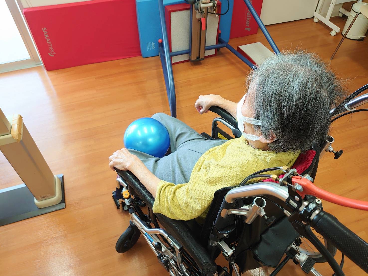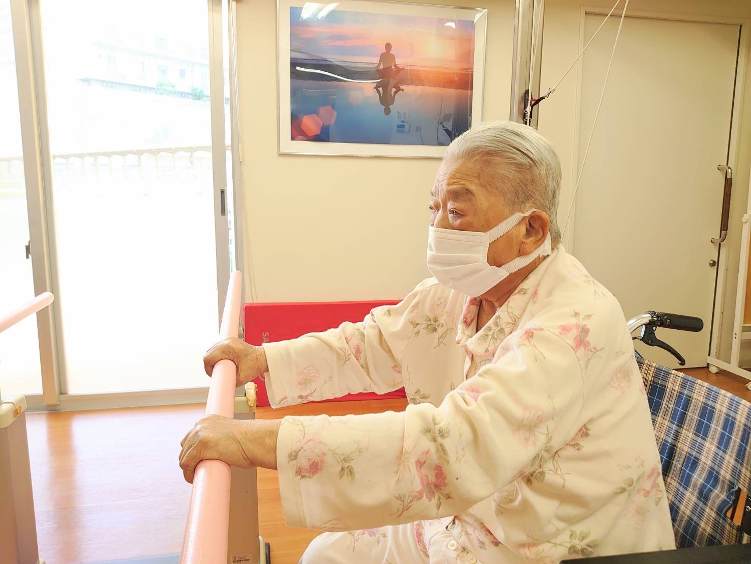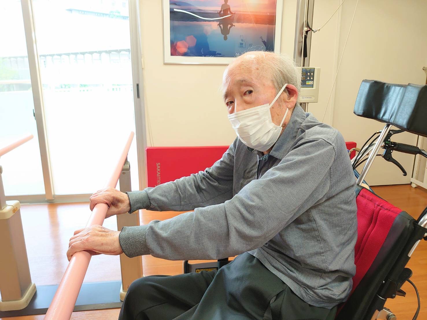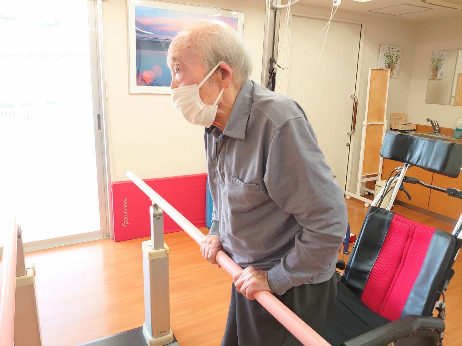 ご家族が面会に来られました。面会後に息子様が廊下を手引き歩行にて下肢筋力運動をされました。