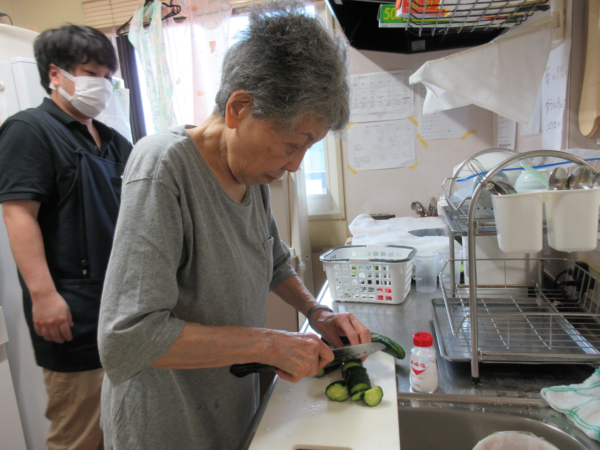 今日はご入居者と畑で採れたきゅうりでお漬物を作りました。