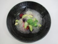 みかん・キウイ・パイナップル・ブルーベリー・ラズベリーに炭酸ゼリーがトッピングされていて、冷たくて美味しかったそうです☆